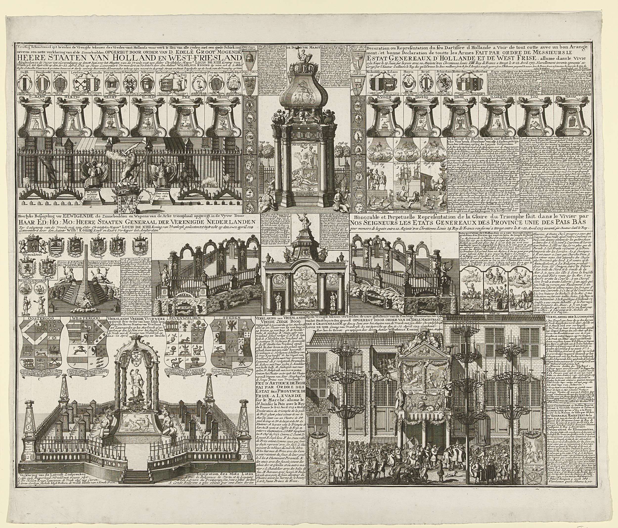 Blad met in één plaat een overzicht van de stellages voor de vuurwerken en de illuminatie bij de viering van de Vrede van Utrecht afgestoken op 14 juni 1713 te Den Haag en Leeuwarden en de illuminatie naast het stadhuis van Den Haag. Met detailvoorstellingen van de allegorische decoraties. Aan weerszijden staan grote kandelaars opgesteld. ...