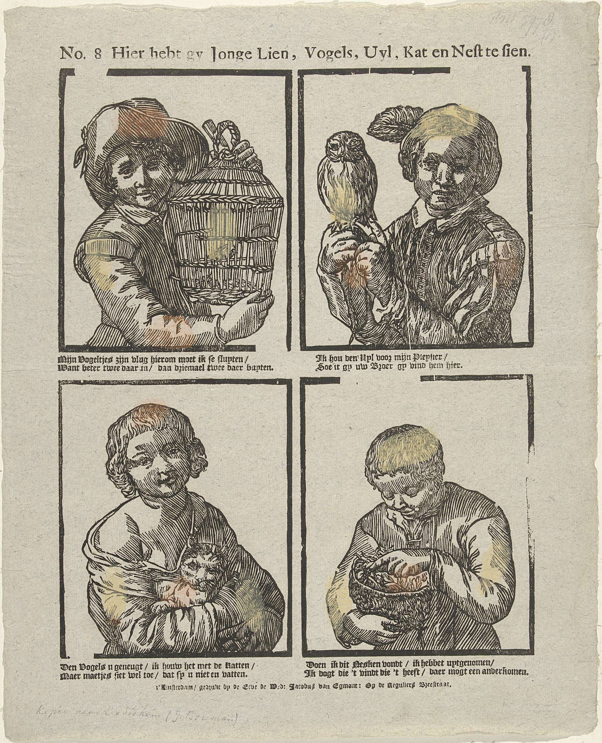 Blad met 4 voorstellingen van kinderen met dieren. Jongen met een vogel in een vogelkooi, jongen met een uil op zijn hand, jongen met een kat in de armen en een jongen met een nestje jonge vogels. Onder elke voorstelling een tweeregelig vers. Genummerd linksboven: No. 8.