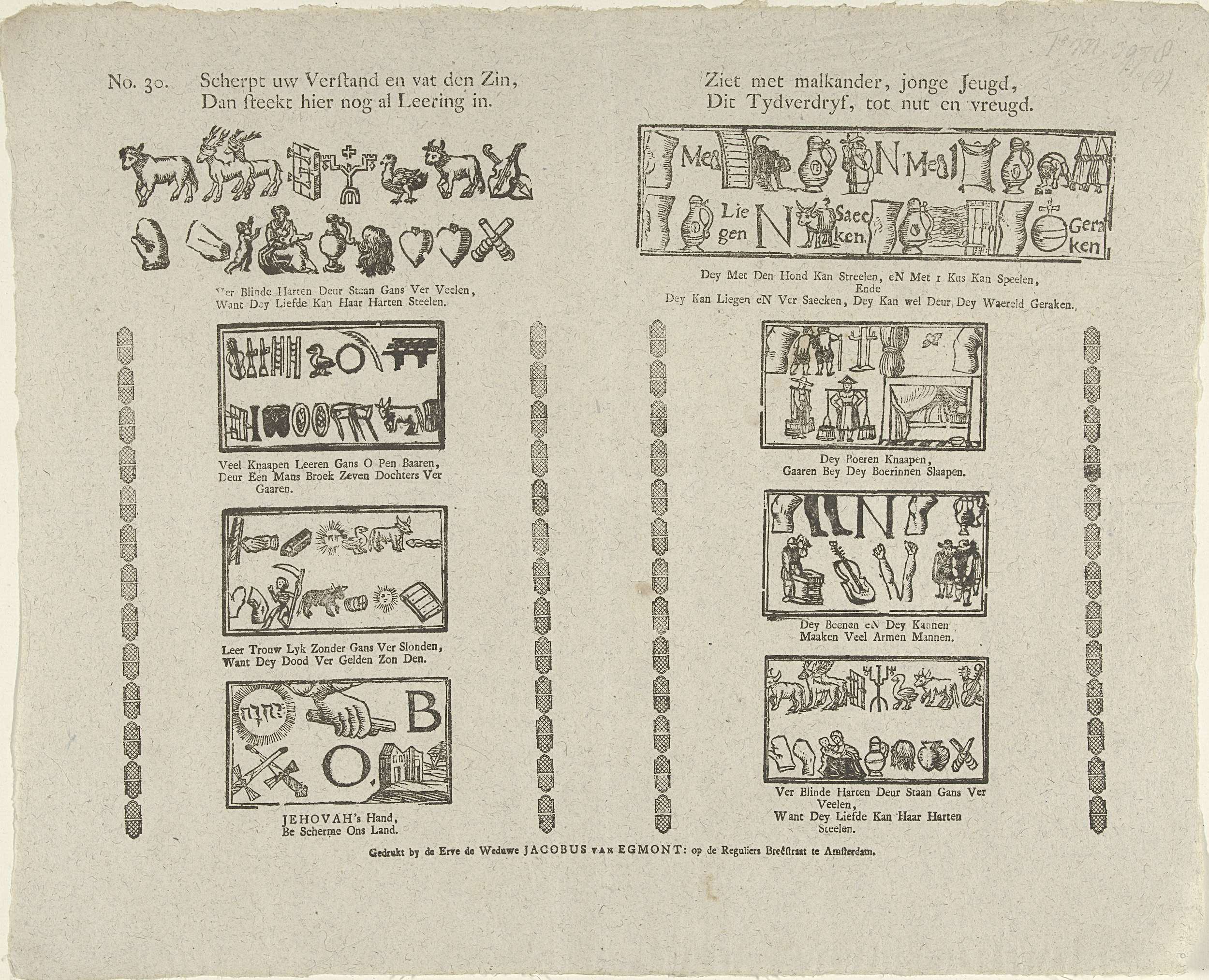 Blad met 8 voorstellingen van rebussen. Onder elke rebus wordt de oplossing gegeven. Genummerd linksboven: No. 30.