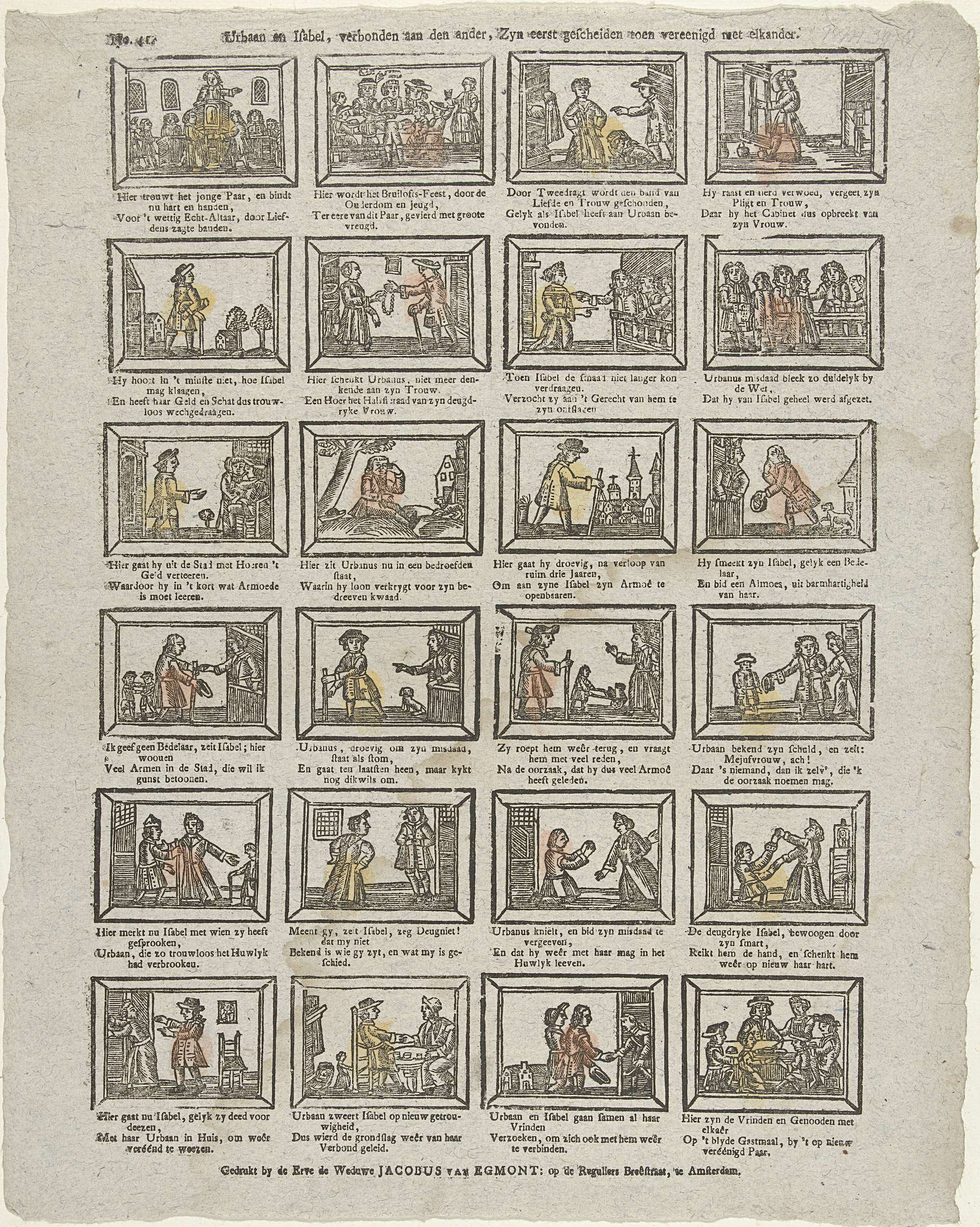 Blad met 36 voorstellingen van het verhaal van Urbaan (Urbanus) en Isabel. Onder elke afbeelding een vers. Genummerd linksboven: No. 41.