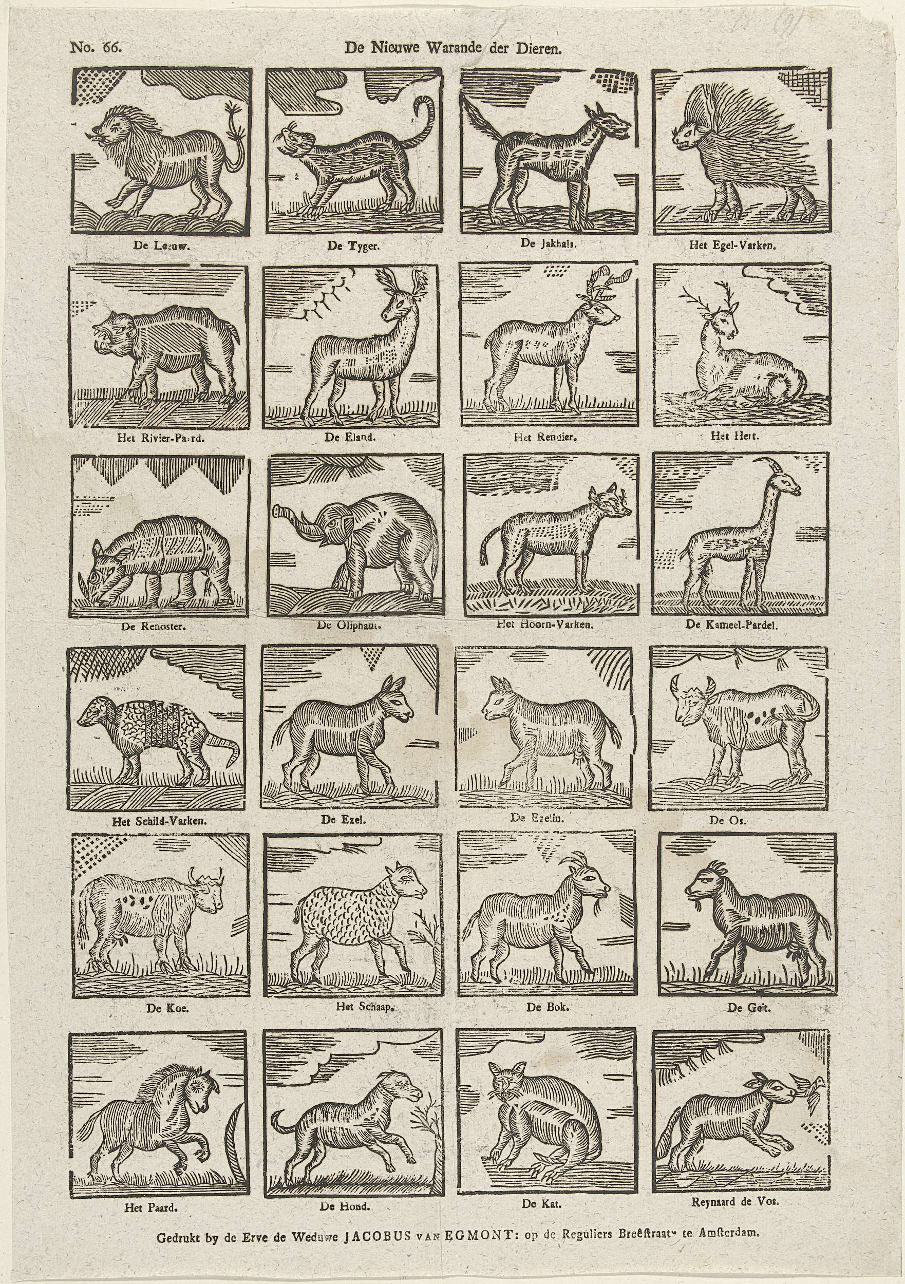 Blad met 36 voorstellingen van dieren, waaronder een leeuw en Reynaard de Vos. Onder elke afbeelding de naam van het dier. Genummerd linksboven: No. 66.