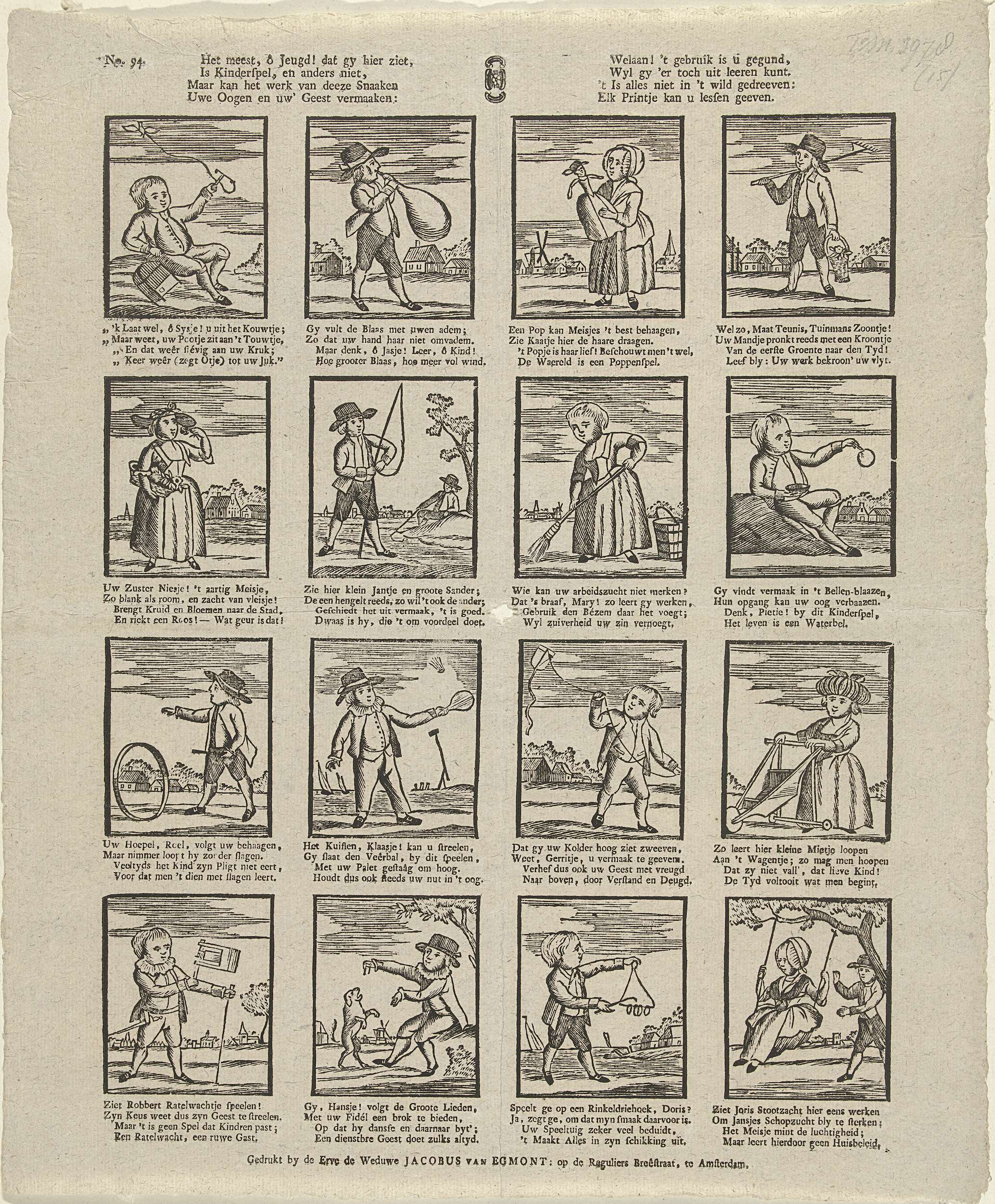 Blad met 16 voorstellingen van kinderspelen, waaronder vliegeren, hoepelen, met de pop spelen en schommelen. Onder elke afbeelding een vierregelig vers. Genummerd linksboven: No. 94.