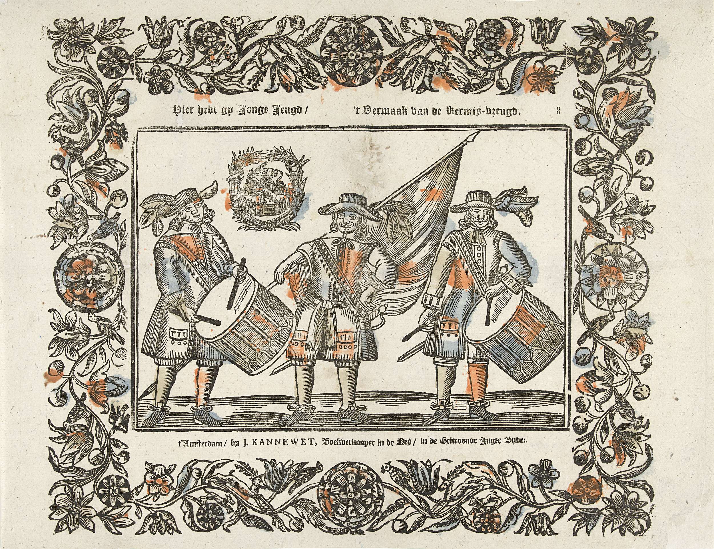 Kermisprent met twee tamboers en een vaandeldrager, met een embleem van de Hollandse leeuw in de Hollandse tuin, gevat in een sierlijst met ranken, dieren en bloemen. Genummerd rechtsboven: 8.