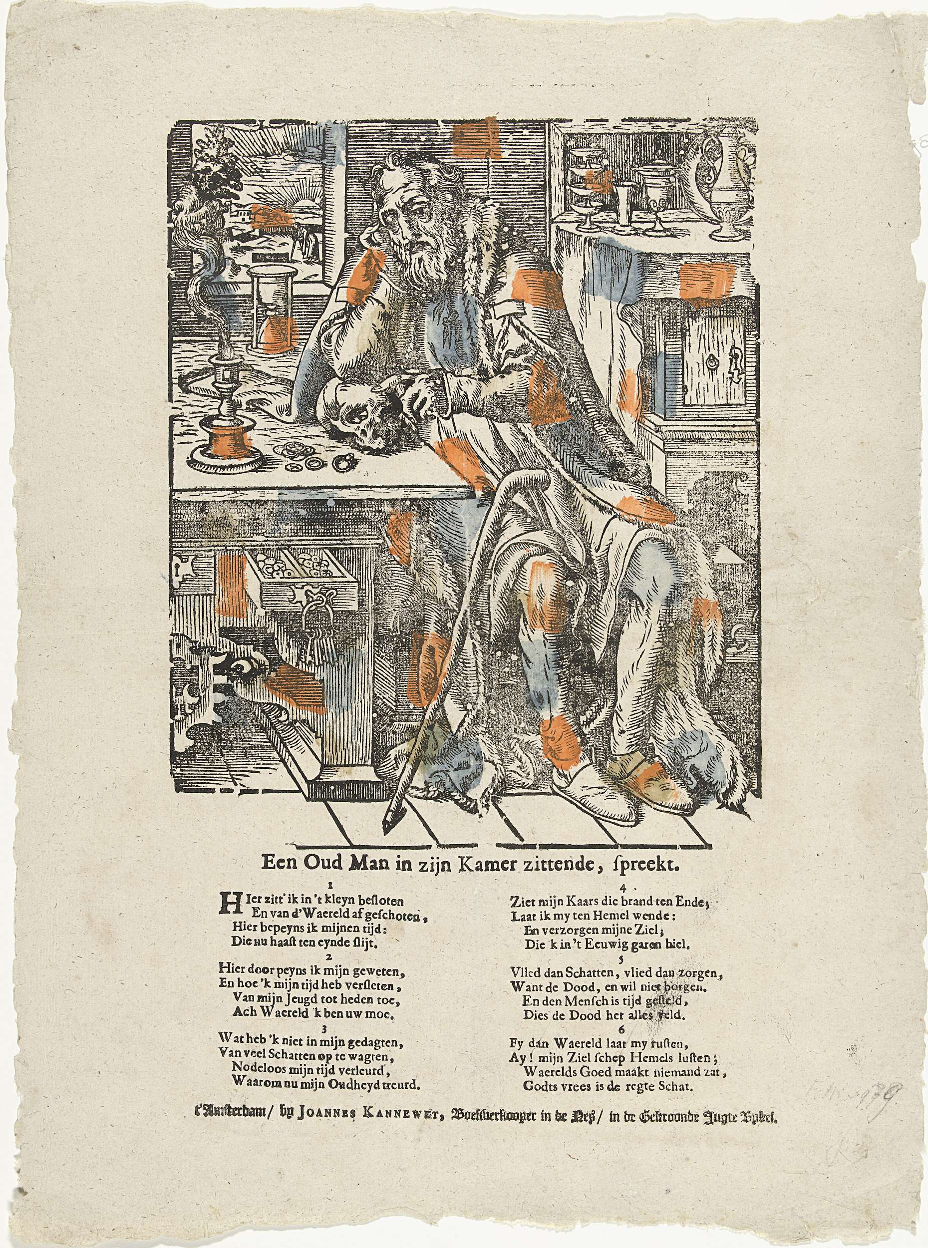 Een oude man zittend overpeinzend in zijn kamer, met het hoofd in de hand en met de andere hand op een schedel. Op tafel een walmende kaars en een zandloper. In een lade geldstukken en kostbare schalen op een kast. Allegorie op de ouderdom en vergankelijkheid, vanitas. Onder de voorstelling een vers in zes verzen.