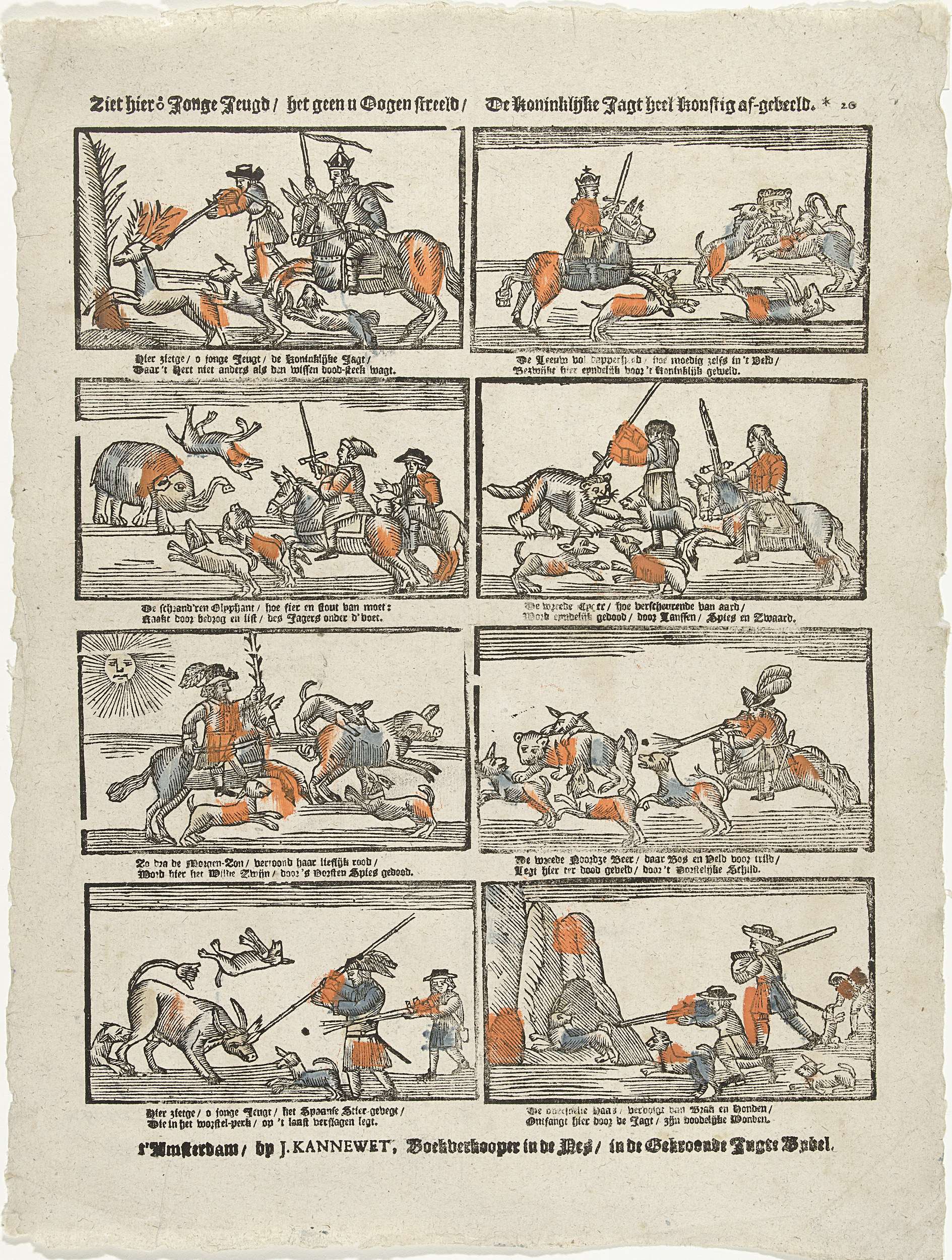 Blad met 8 voorstellingen van de koning op jacht naar verschillende soorten dieren. Onder elke afbeelding een tweeregelig vers. Genummerd: *20.