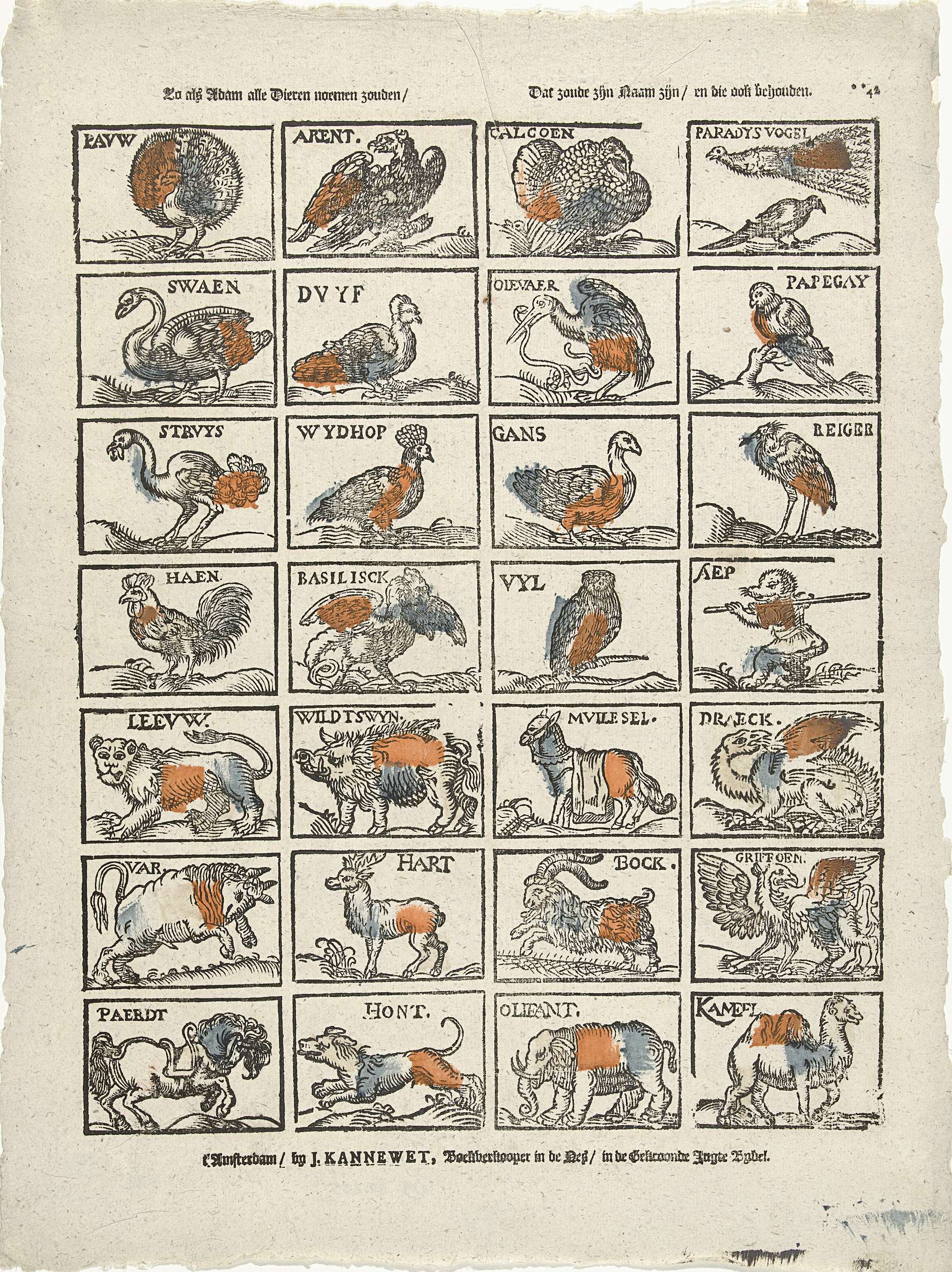 Blad met 28 voorstellingen van vogels, zoogdieren en enkele fantasiedieren. In elke voorstelling de naam gesneden in het houtblok. Genummerd rechtsboven: **42.