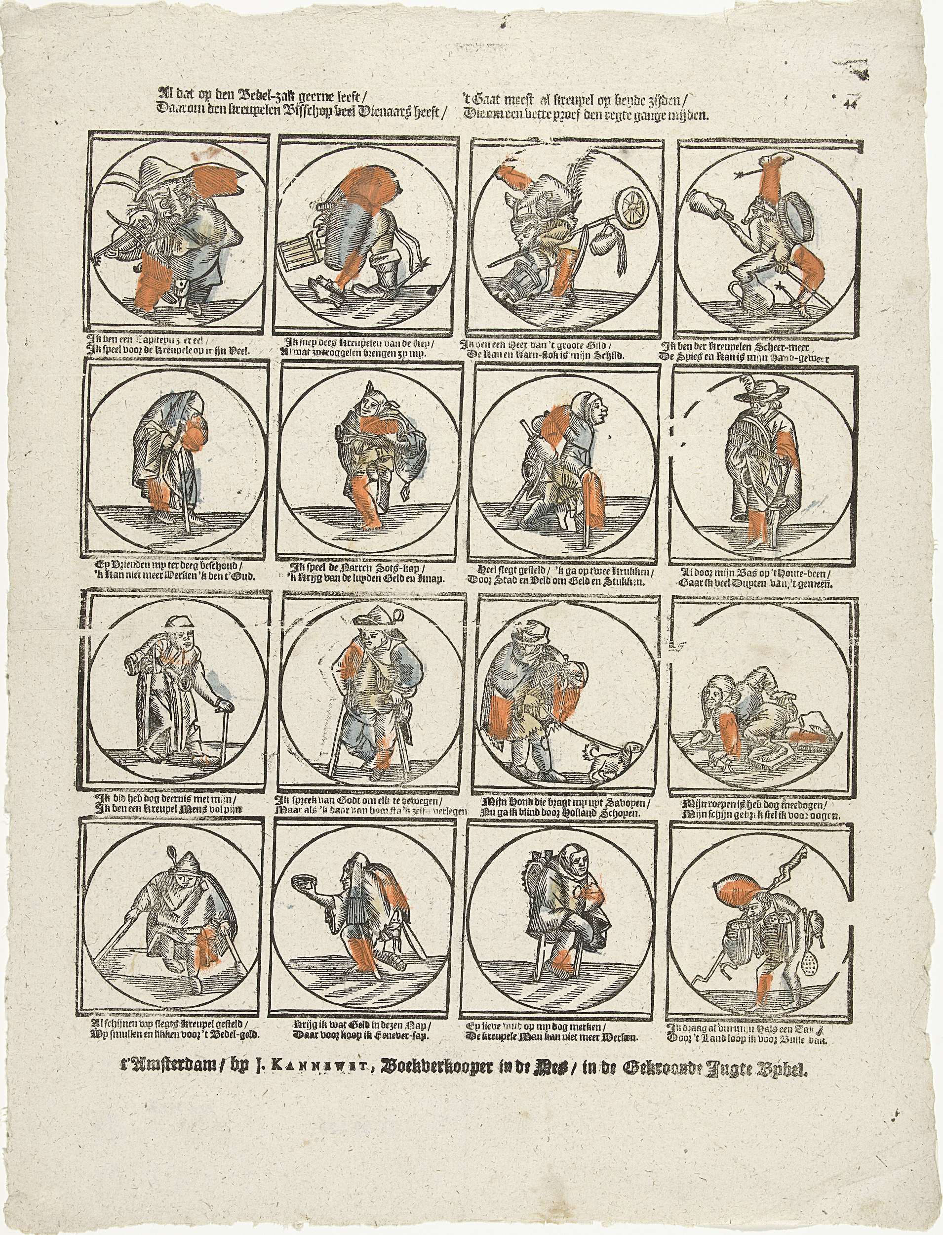 Blad met 16 medaillons met voorstellingen van bedelaars met lichamelijke beperkingen en monsterachtige fantasiewezens. Onder elke afbeelding een tweeregelig vers. Genummerd rechtsboven: *44.