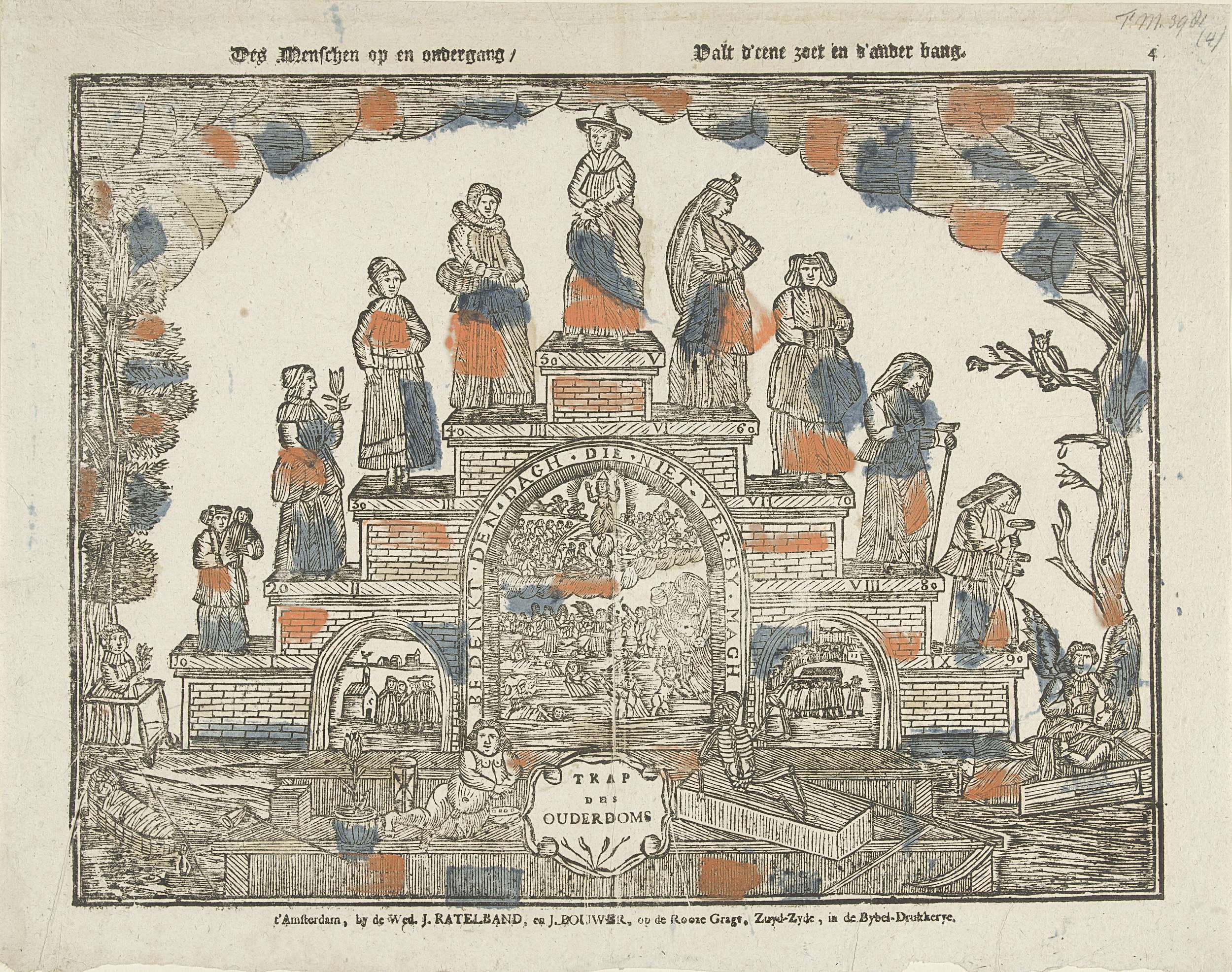 Een trap des ouderdoms: een vrouwentrap. Op de treden van de trap, in de vorm van een brug, staan vrouwen in de leeftijd van 0 tot 100 jaar. Onder de brug een voorstelling van het Laatste Oordeel. Linksvoor een putto en rechtsvoor de dood. Genummerd rechtsboven: 4.
