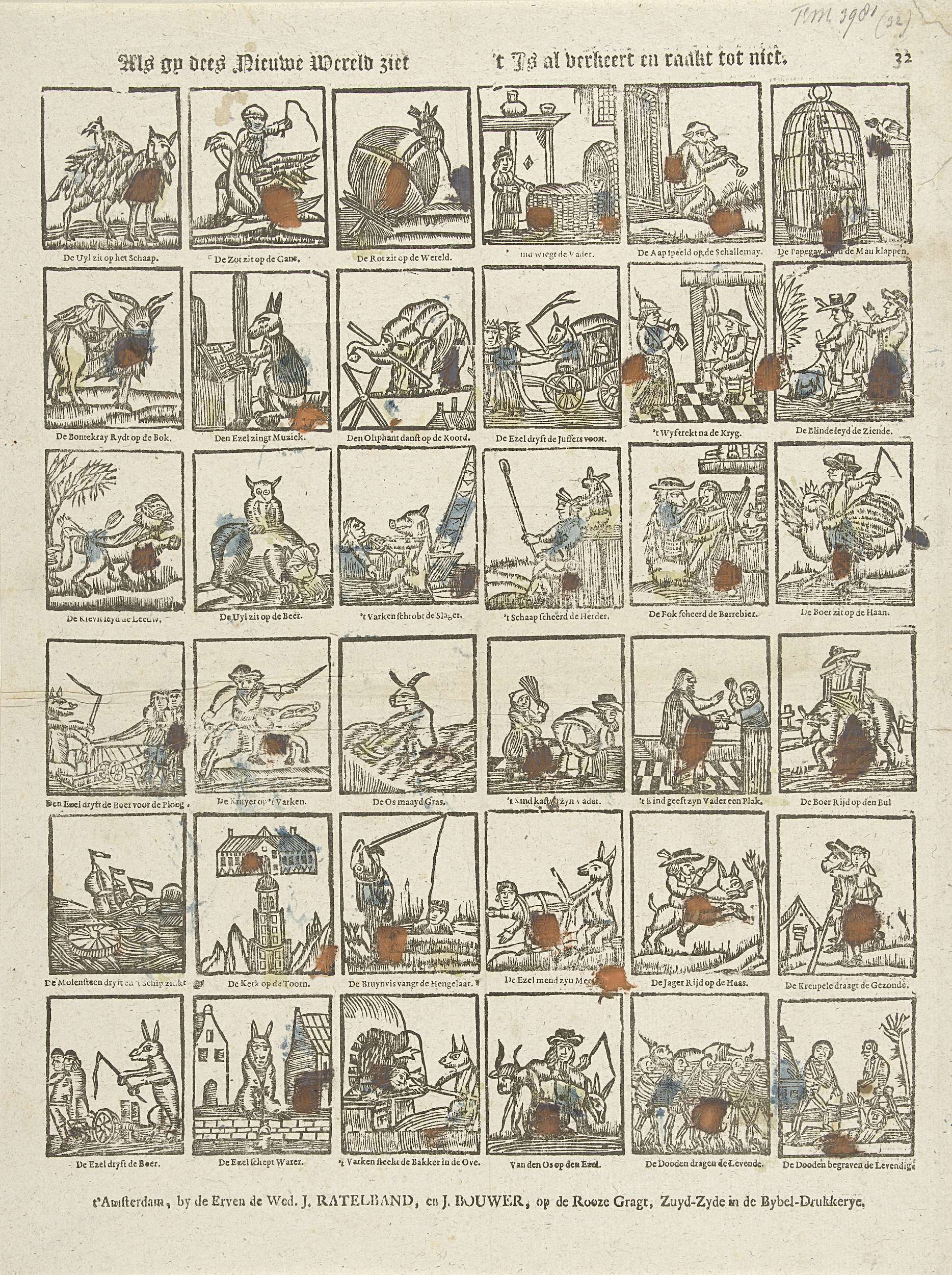 Blad met 36 voorstellingen van de verkeerde wereld.Onder elke afbeelding een eenregelig onderschrift. Genummerd rechtsboven: 32.