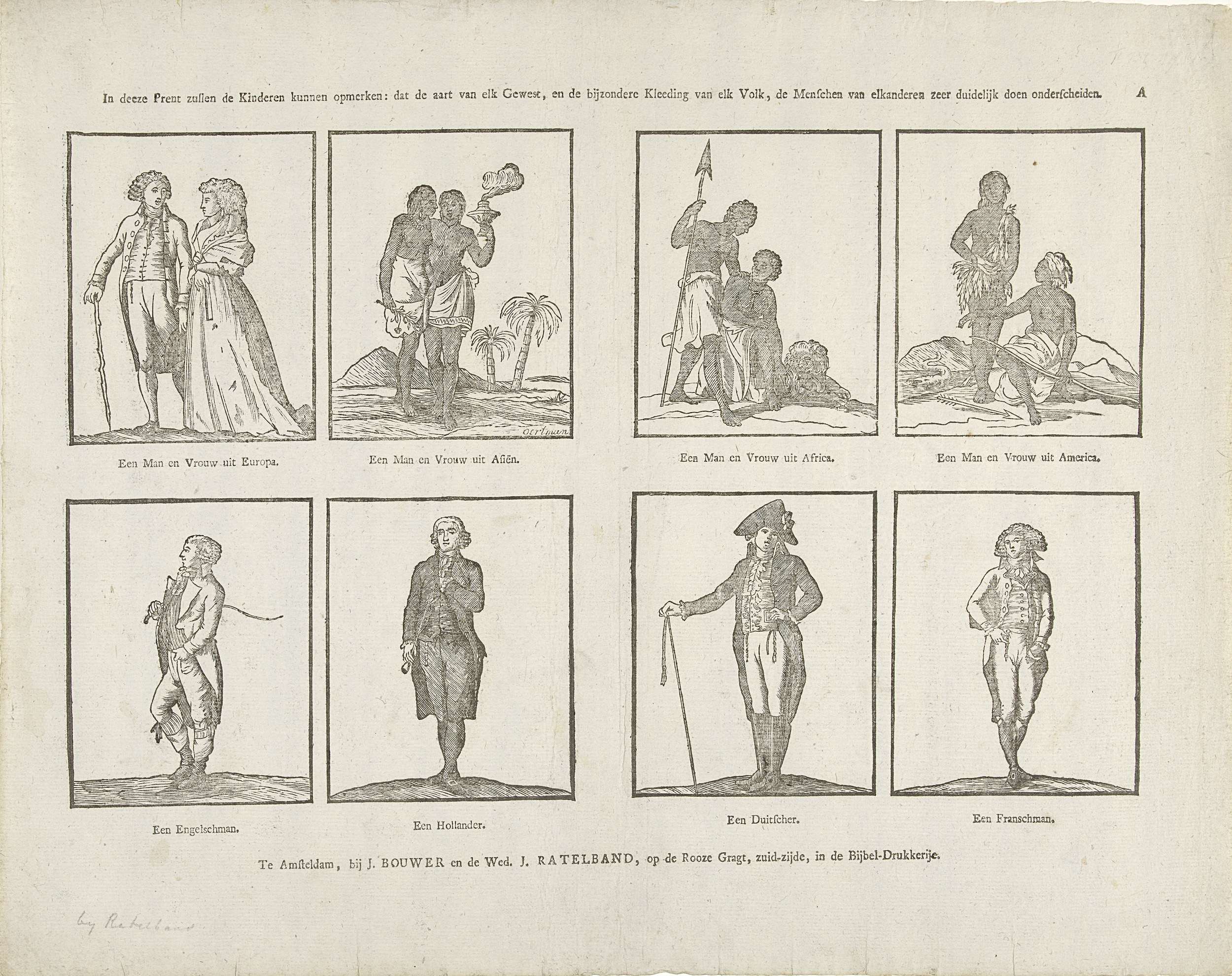 Blad met 8 voorstellingen van de kleding van verschillende nationaliteiten en volkeren. Onder elke afbeelding een onderschrift. Genummerd rechtsboven: A.