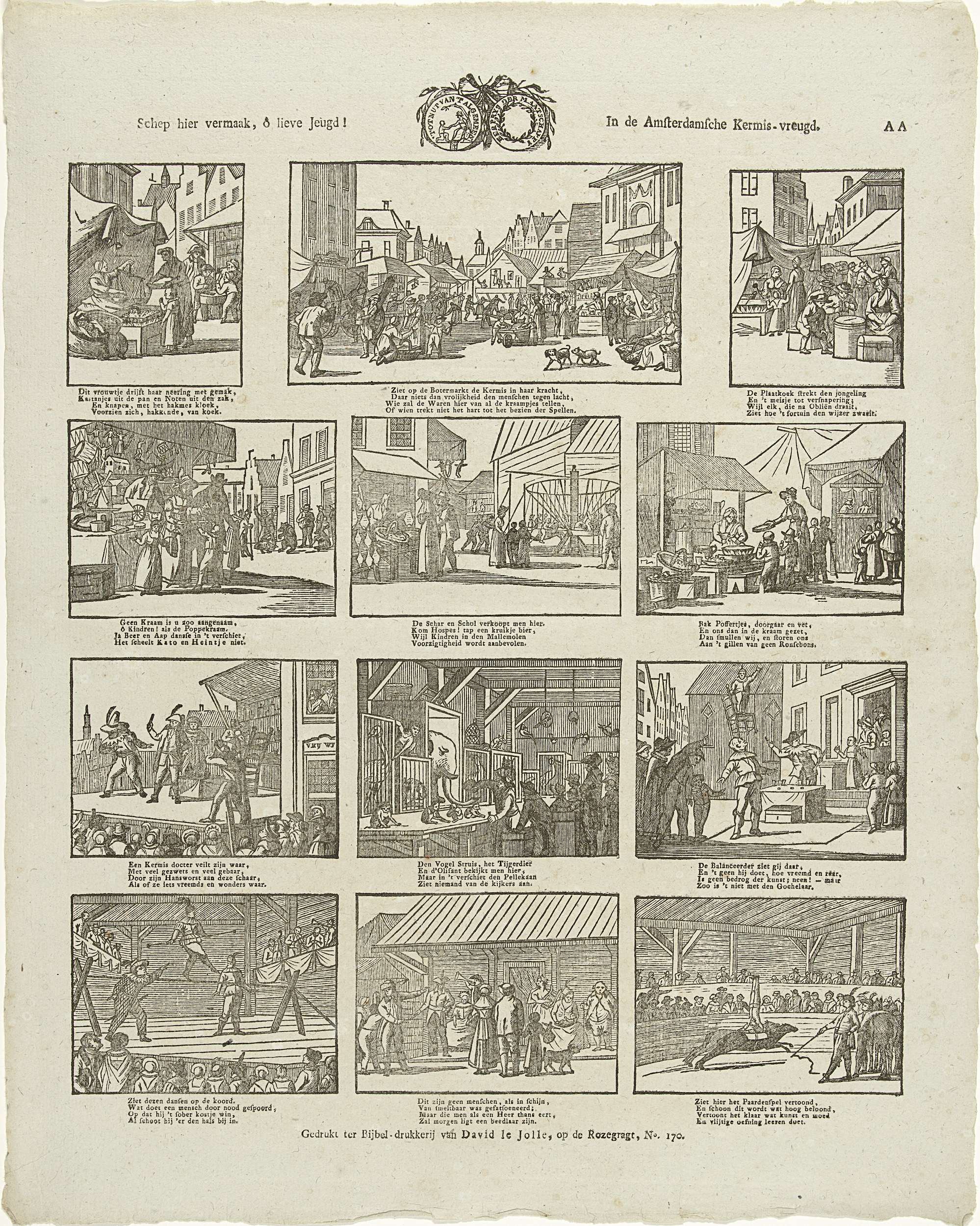Blad met 12 voorstellingen van de attracties, kramen, voorstellingen en bezienswaardigheden op de Amsterdamse kermis. Midden boven het zegel van de Maatschappij tot Nut van 't Algemeen. Onder elke afbeelding een vierregelig vers. Genummerd rechtsboven: AA.