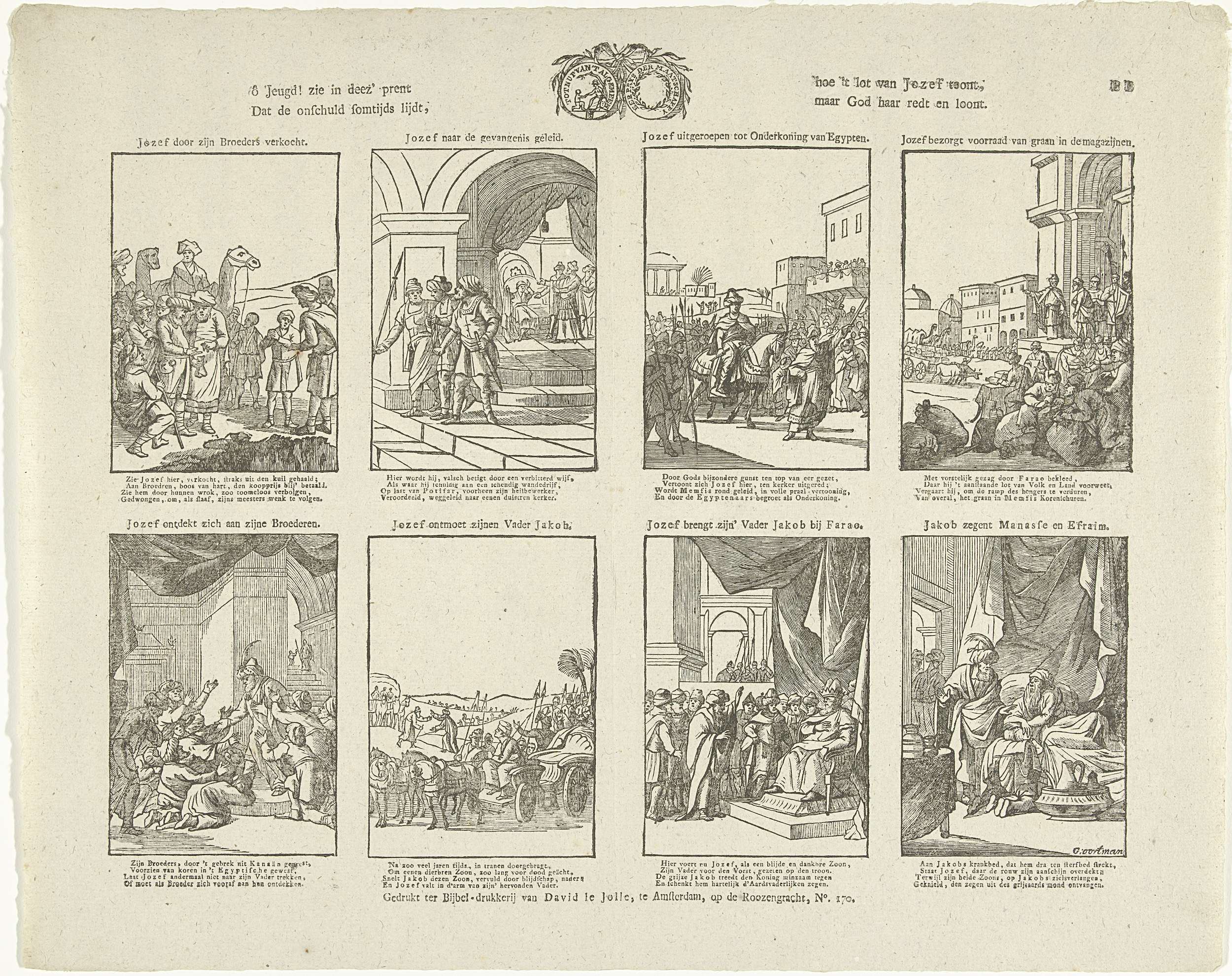 Blad met 8 voorstellingen van het verhaal van Jozef. Midden boven het zegel van de Maatschappij tot Nut van 't Algemeen. Oven elke afbeelding een titel, onder elke afbeelding een vierregelig vers. Genummerd rechtsboven: BB.
