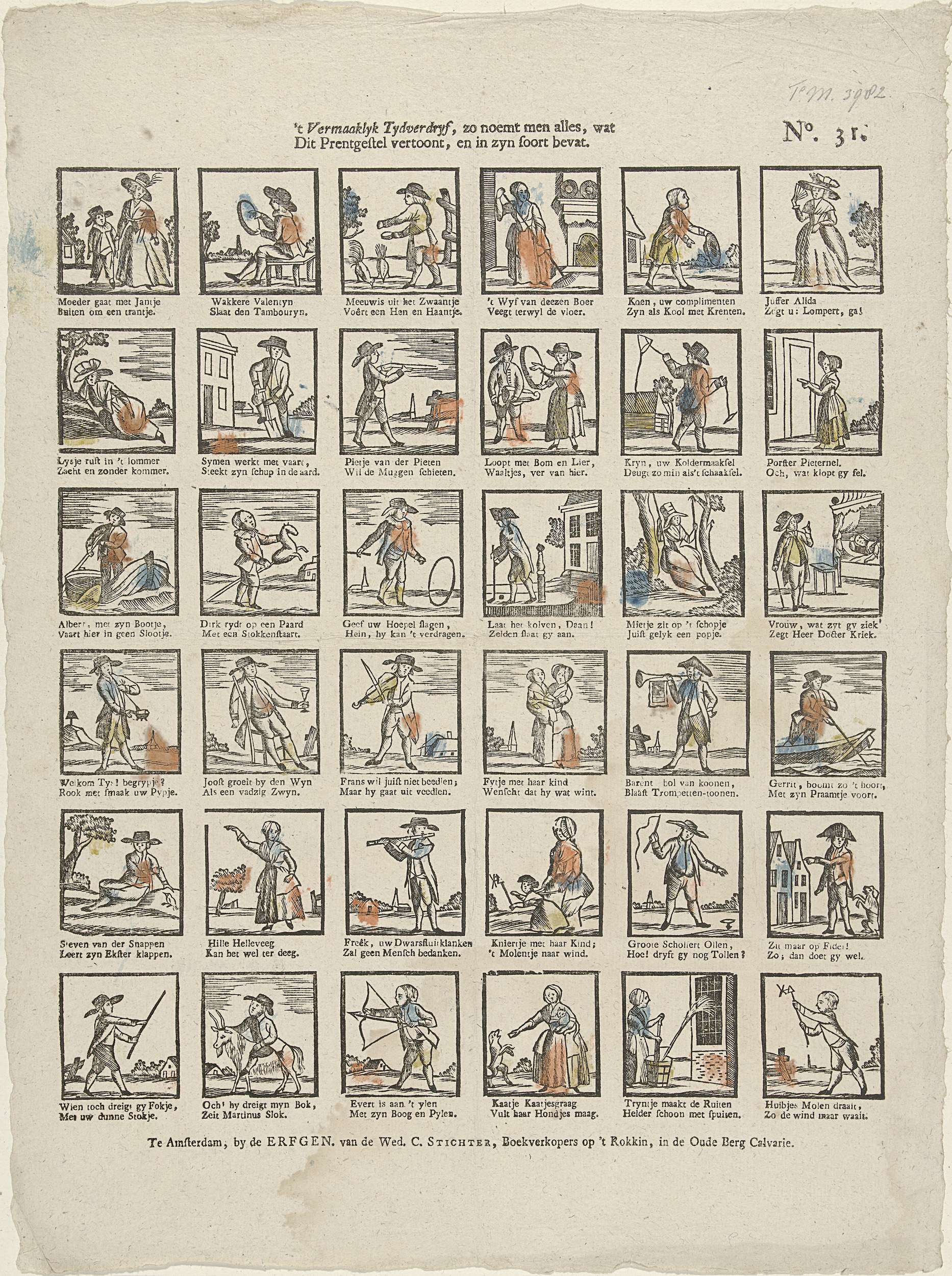 Blad met 36 voorstellingen van tijdverdrijf, kinderspelen en vormen van recreatie. Onder elke afbeelding een tweeregelig vers. Genummerd rechtsboven: No. 31.