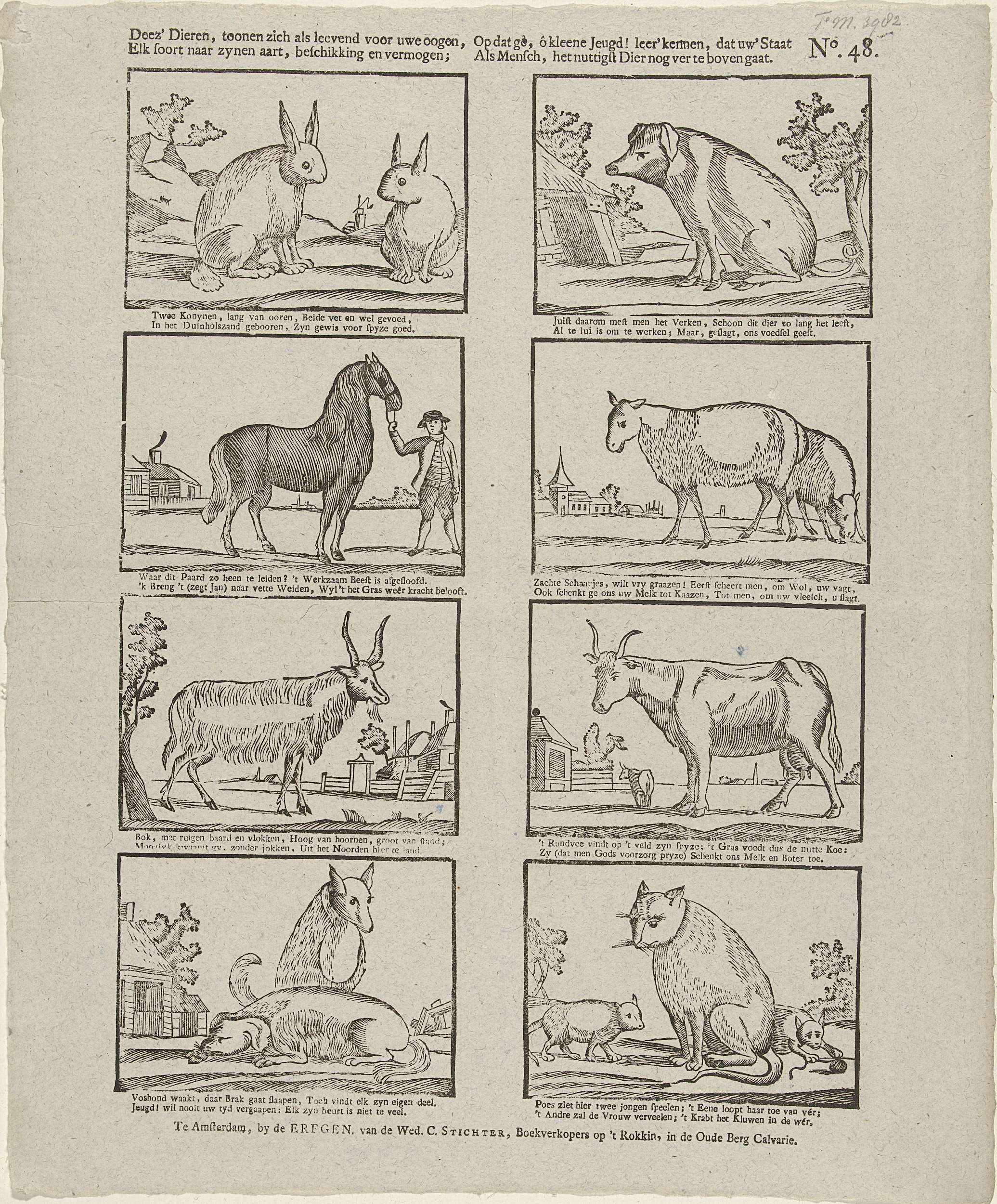 Blad met 8 voorstellingen van dieren, zoals konijnen, een varken en een paard. Onder elke afbeelding een tweeregelig vers. Genummerd: No. 48.