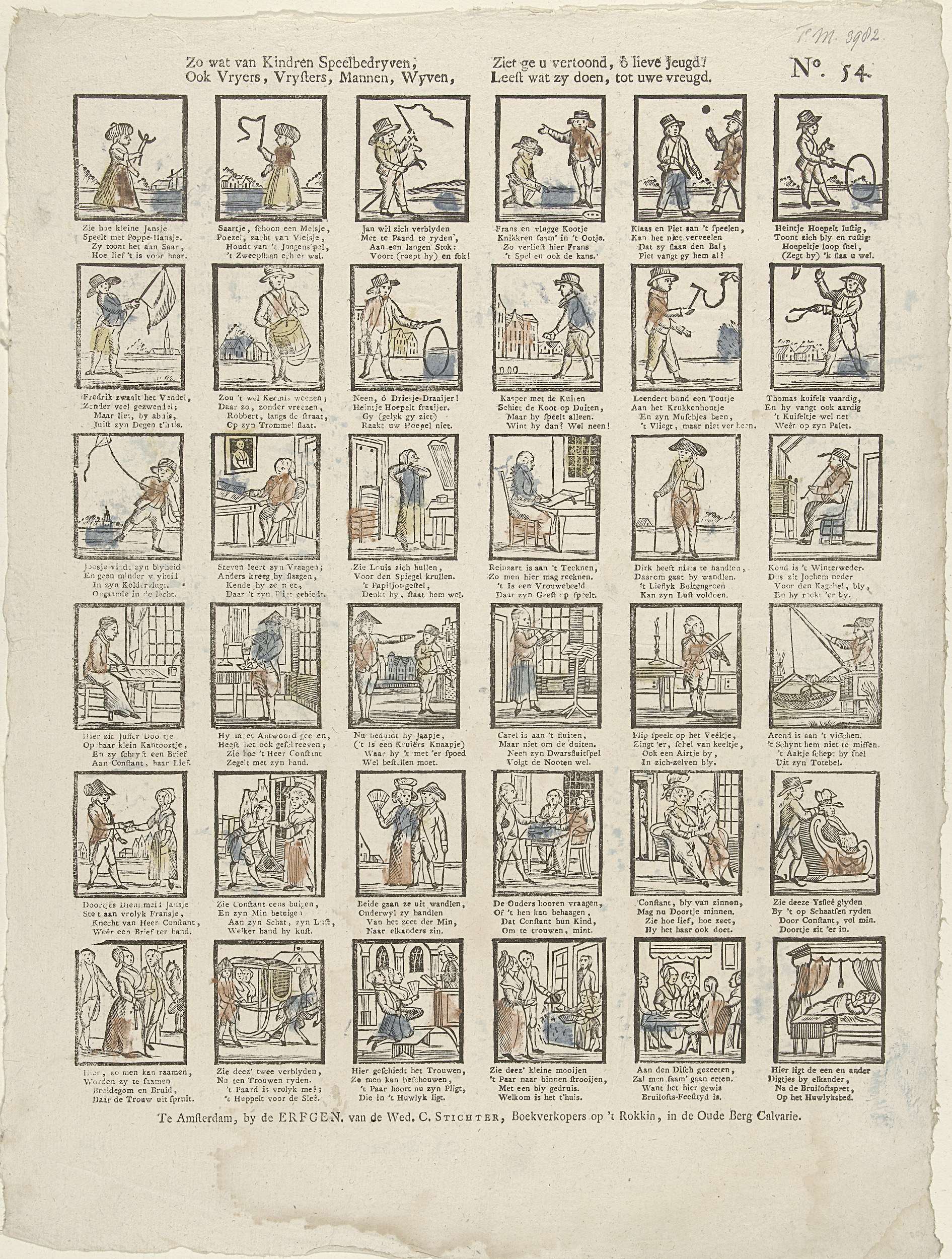 Blad met 36 voorstellingen van kinderspelen en bezigheden, zoals stokpaardje rijden, hoepelen, vliegeren en vissen. Onder elke afbeelding een vierregelig vers. Genummerd rechtsboven: No. 54.
