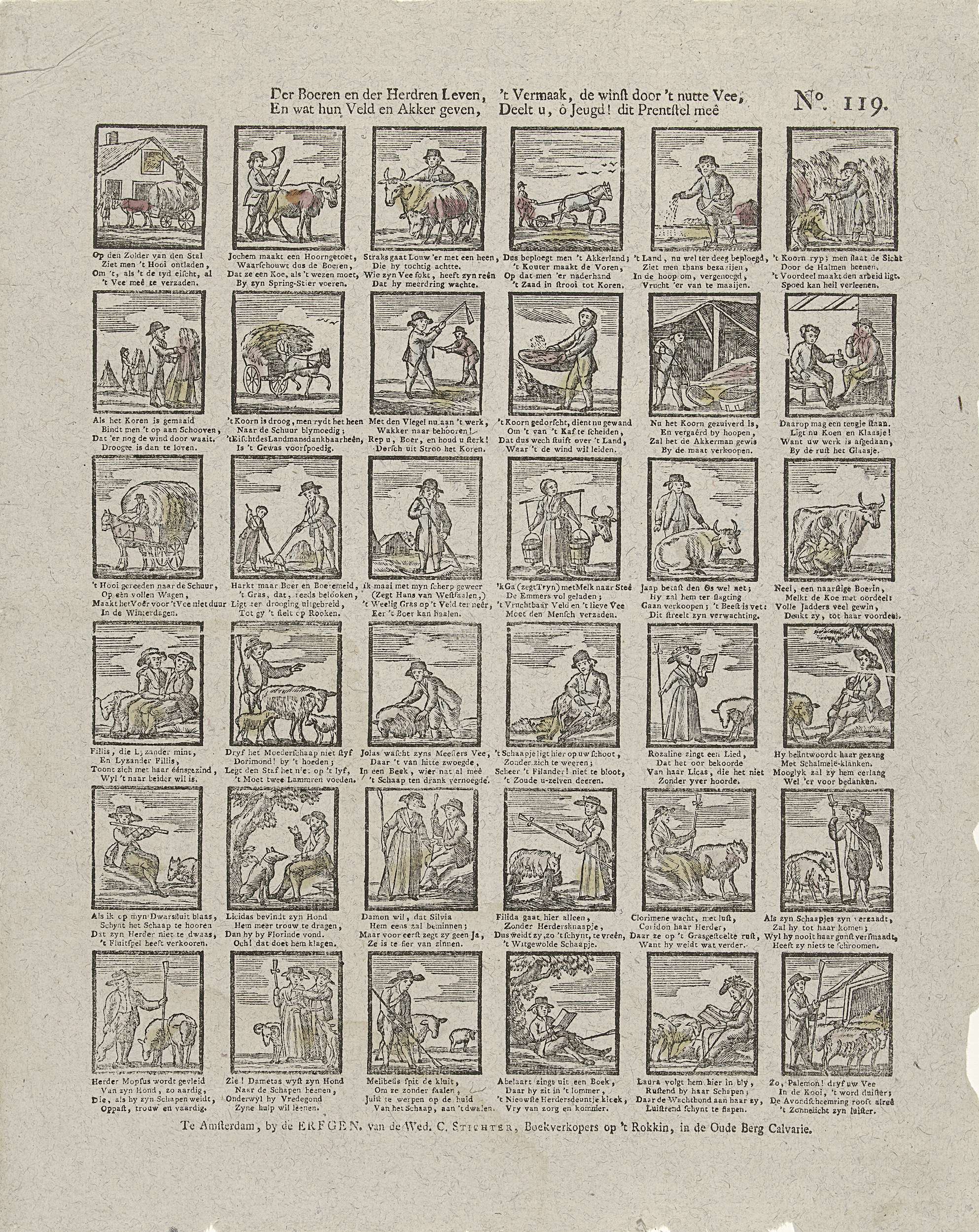 Blad met 36 voorstellingen uit het leven en werk van de boer en de herder. Onder elke afbeelding een vierregelig vers. Genummerd: No. 119.