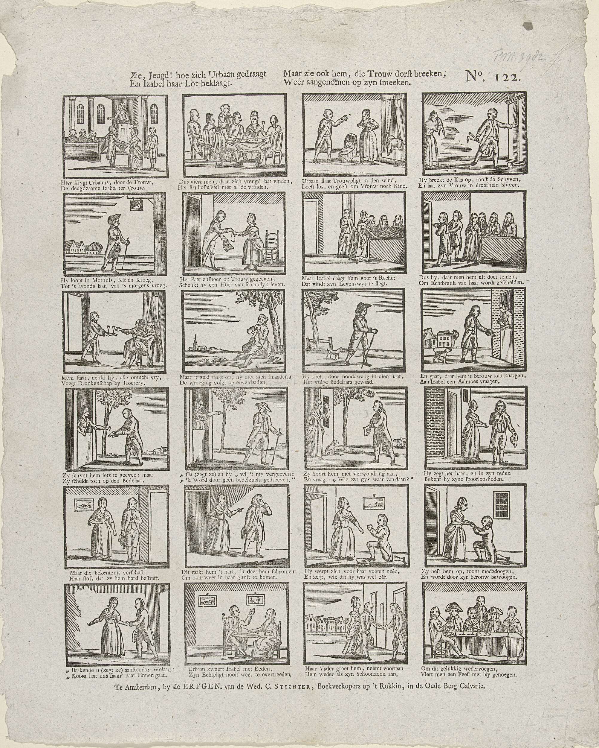 Blad met 24 voorstellingen uit het verhaal van Urbaan (Urbanus) en Isabel. Urbaan verzaakt zijn echtplicht en verlaat zijn vrouw en spendeert al hun geld in de herberg, in de bedelstaf geraakt bekent hij zijn schuld en wordt door Isabel weer in genade teruggenomen. Onder elk plaatje een tweeregelig vers. Genummerd rechtsboven: No. 122.