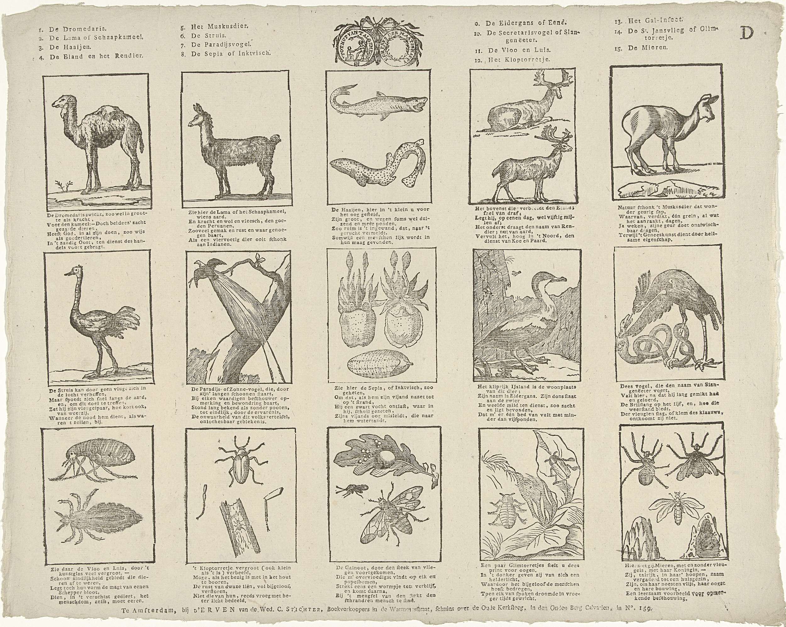 Blad met 15 voorstellingen van allerlei soorten dieren: bovenaan viervoeters, in het midden vogels, onderaan insecten. Met bovenaan de zegel van de Maatschappij tot Nut van 't Algemeen. Onder elke afbeelding een vierregelig vers. Gemerkt rechtsboven: D.