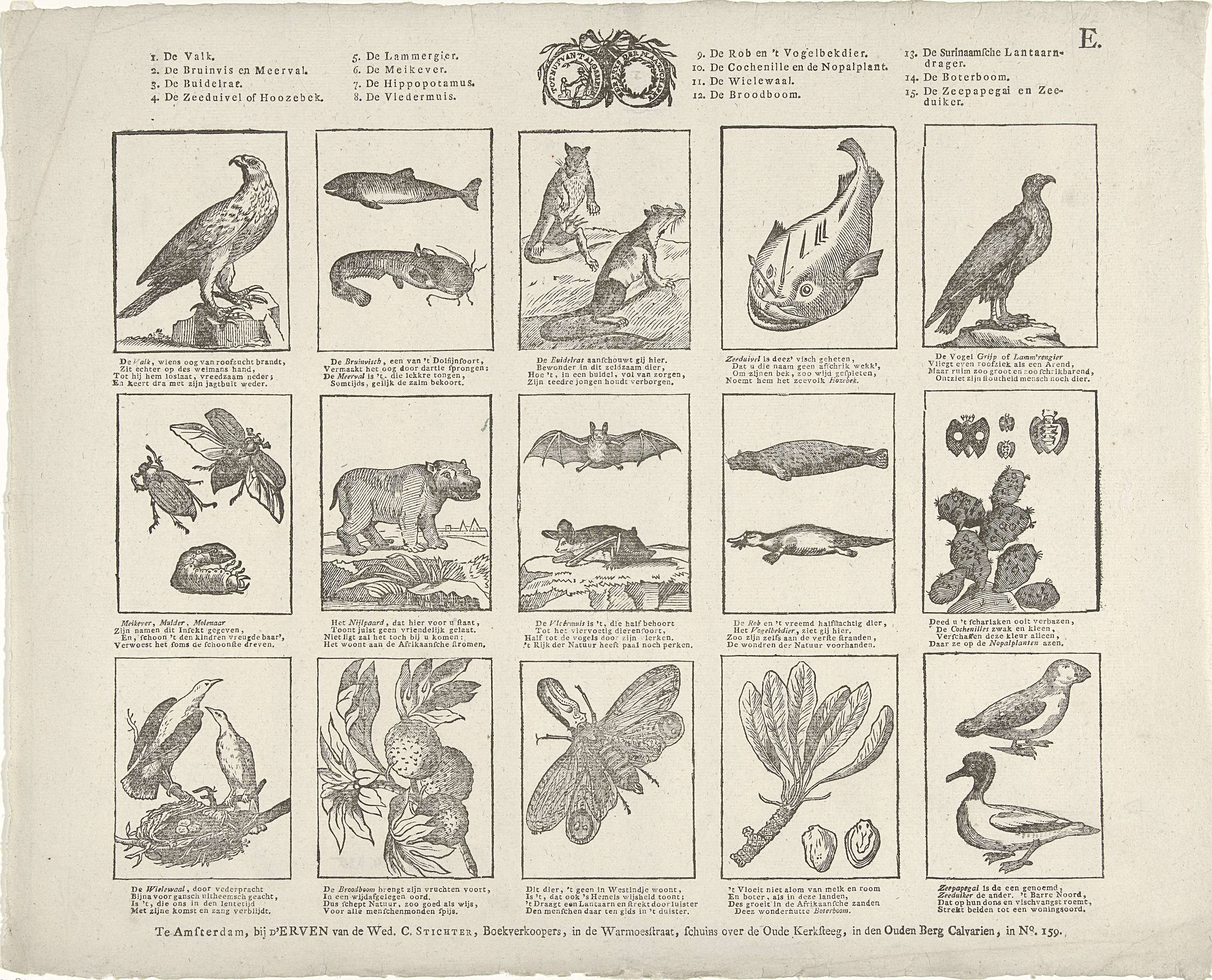 Blad met 15 voorstellingen van allerlei soorten dieren. Met bovenaan de zegel van de Maatschappij tot Nut van 't Algemeen. Onder elke afbeelding een vierregelig vers. Gemerkt rechtsboven: E.