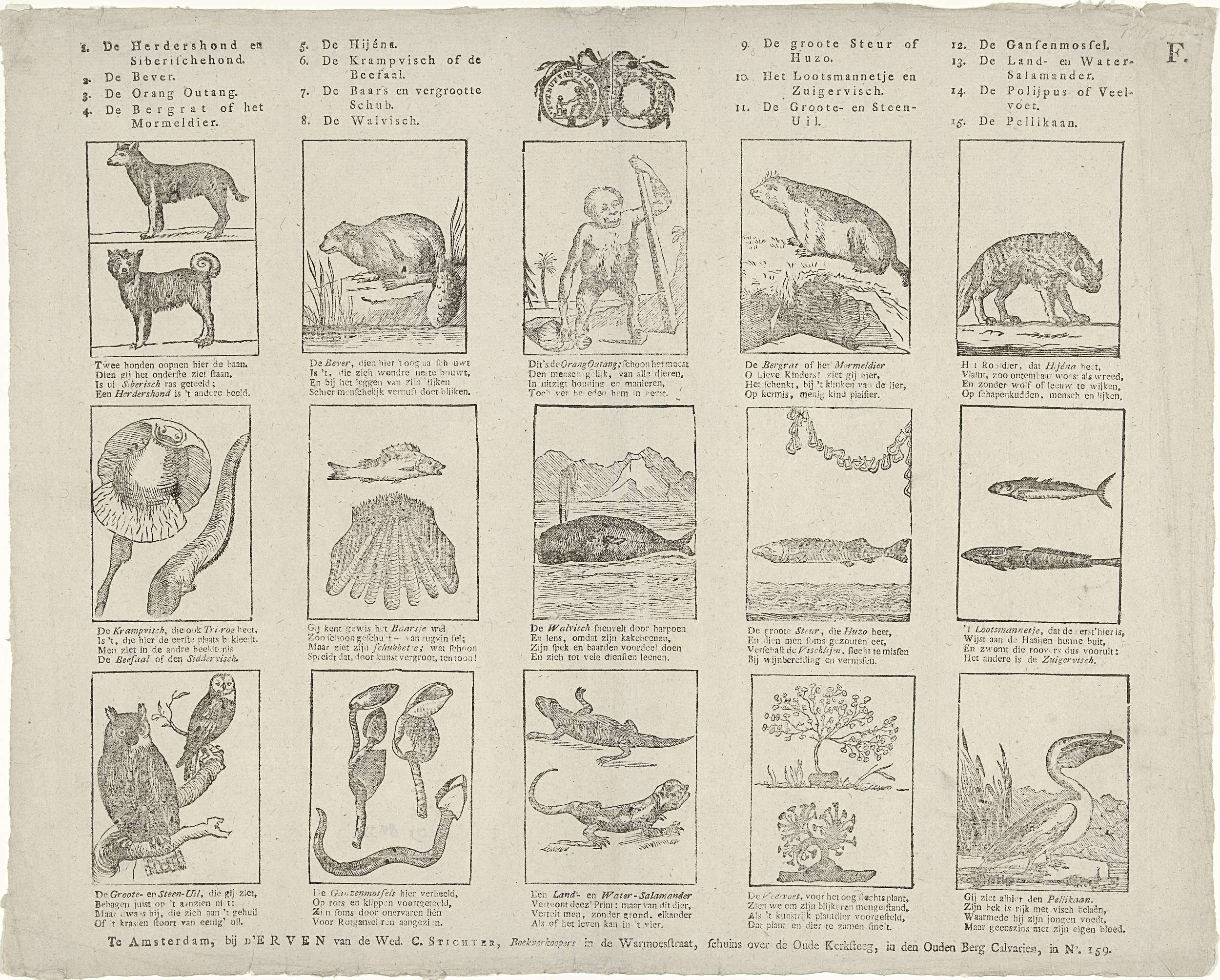 Blad met 15 voorstellingen van allerlei soorten dieren. Met bovenaan de zegel van de Maatschappij tot Nut van 't Algemeen. Onder elke afbeelding een vierregelig vers. Gemerkt rechtsboven: F.