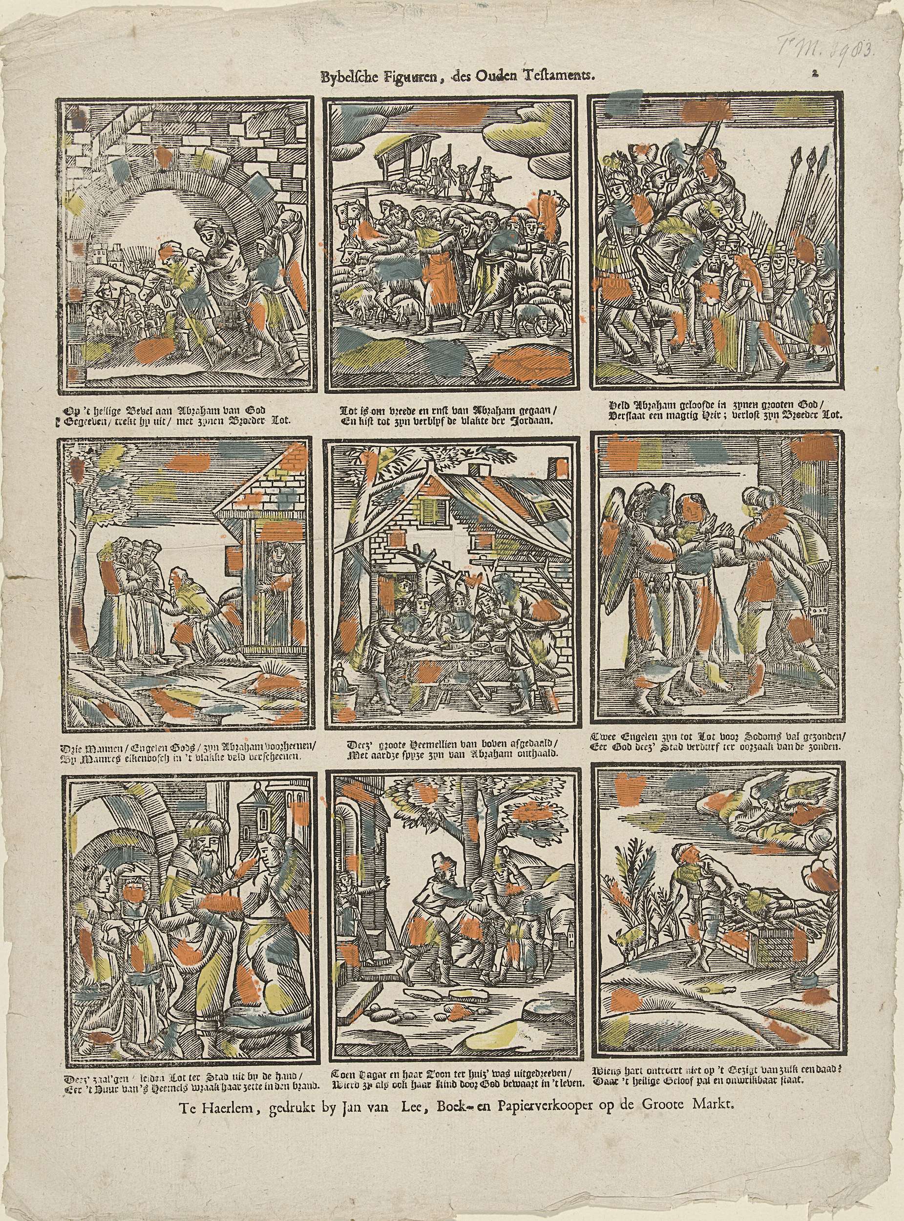 Blad met 9 voorstellingen van het verhaal van Abraham uit het Oude Testament. Onder elk plaatje een tweeregelig versje. Genummerd rechtsboven: 2.