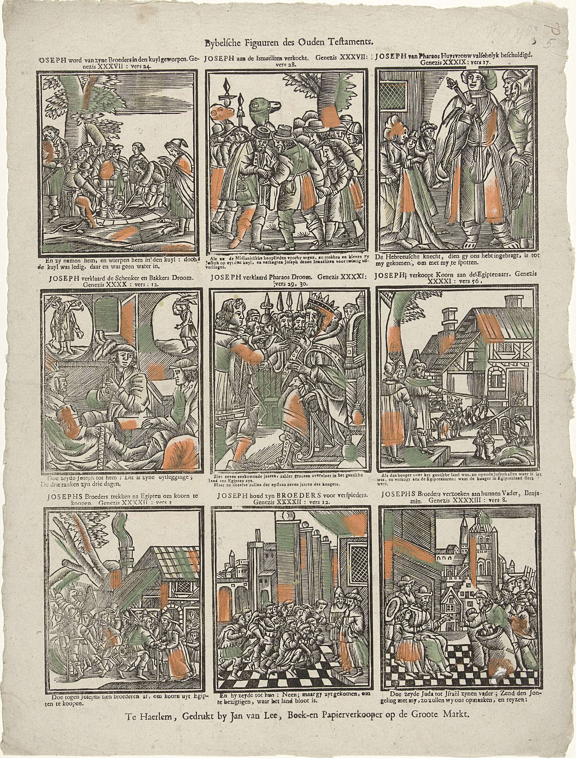 Blad met 9 voorstellingen van het verhaal van Jozef in het Oude Testament. Boven elk plaatje een titel en de bijbelverwijzing, eronder het bewuste vers. Genummerd: 3 (of 5).