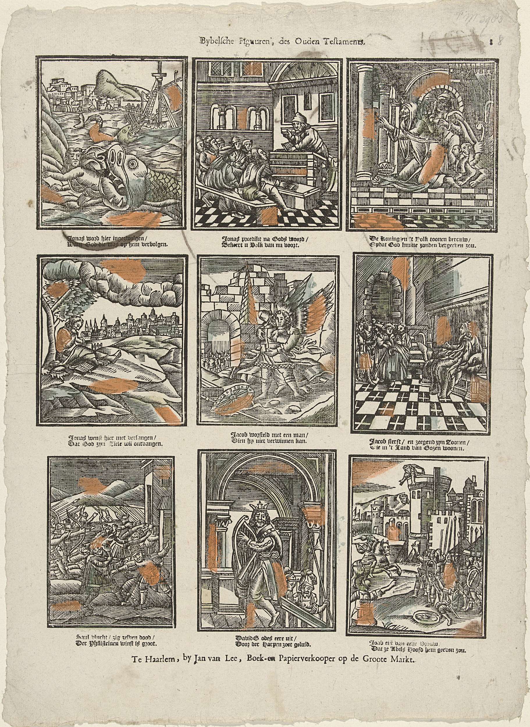 Blad met 9 voorstellingen van verhalen uit het Oude Testament, van Jona tot Joab. Onder elk plaatje een tweeregelig versje. Genummerd: 8.