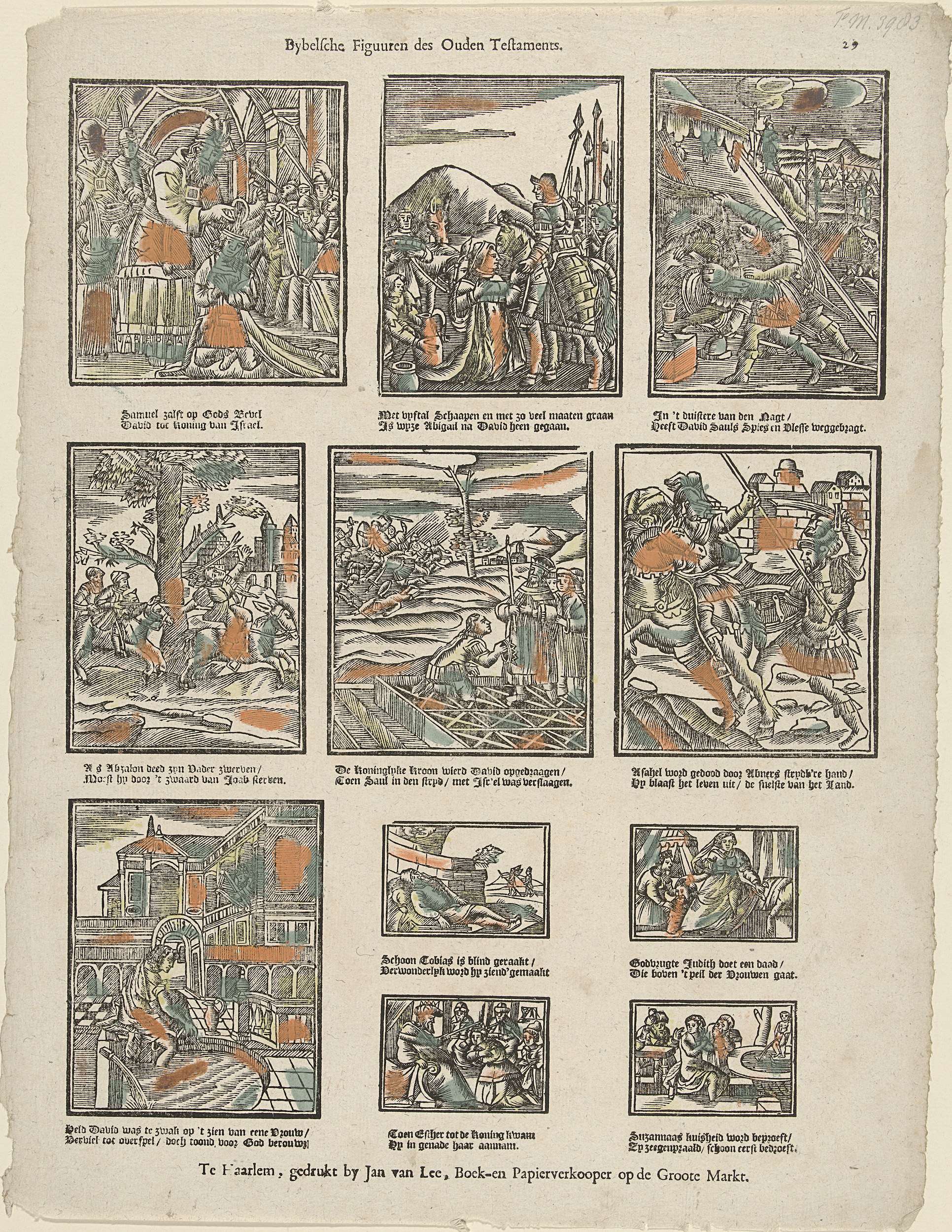 Blad met 7 grote voorstellingen van het verhaal van David en 4 kleine voorstellingen van andere verhalen uit het Oude Testament. Onder elk plaatje een tweeregelig versje. Genummerd: 29.