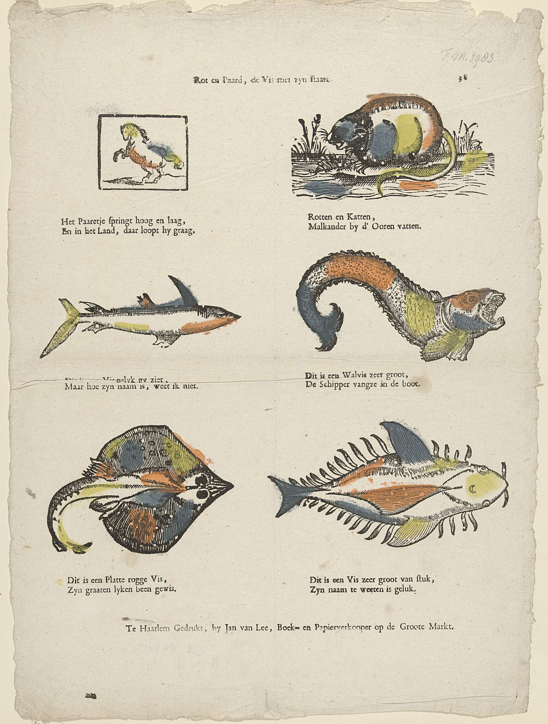 Blad met 6 voorstellingen van dieren (twee zoogdieren en vier vissen). Onder elk plaatje een tweeregelig versje. Genummerd: 38.