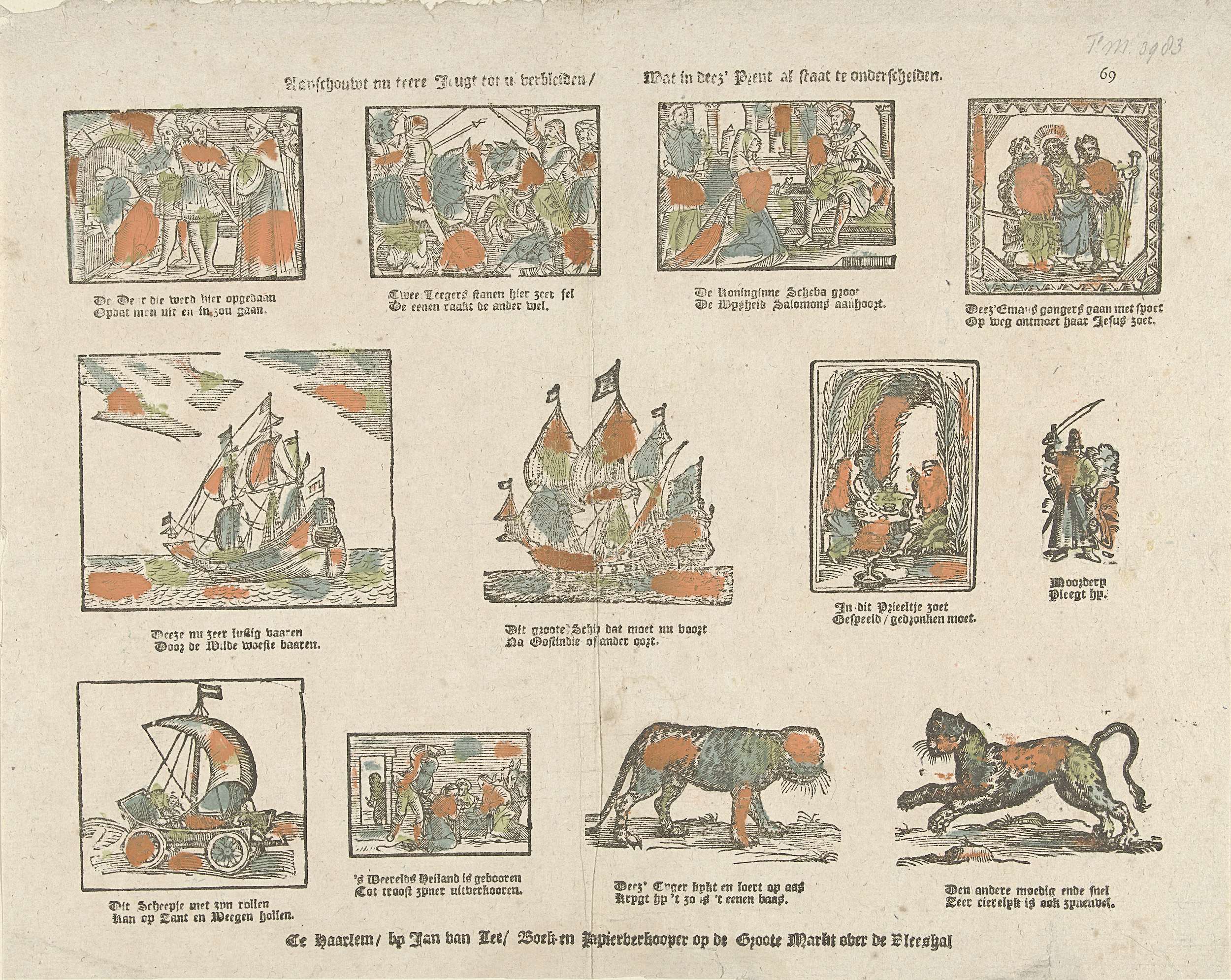 Blad met 16 verschillende voorstellingen van bijbelse verhalen, schepen, de zeilwagen en dieren. Onder elk plaatje een tweeregelig versje. Genummerd: 69.