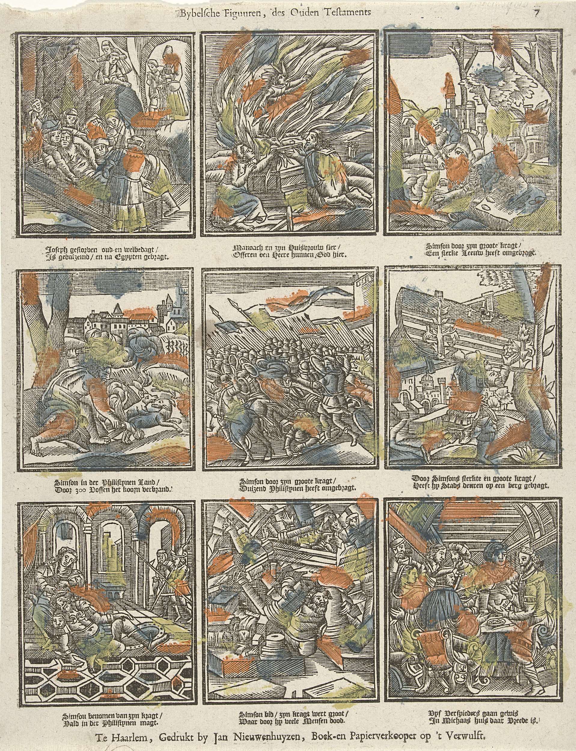 Blad met 9 voorstellingen uit het verhaal van Jozef en van Simson uit het Oude Testament. Onder elk plaatje een tweeregelig versje. Genummerd rechtsboven: 7.