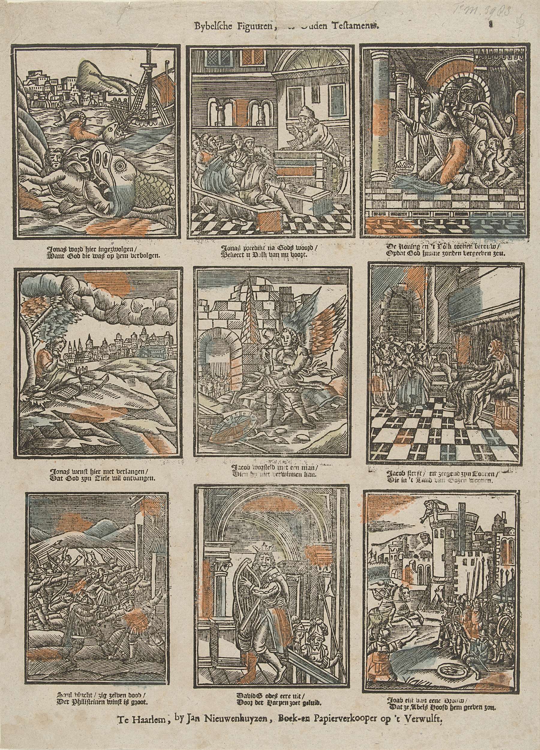 Blad met 9 voorstellingen van verhalen uit het Oude Testament, van Jona tot Joab. Onder elk plaatje een tweeregelig versje. Genummerd rechtsboven: 8.