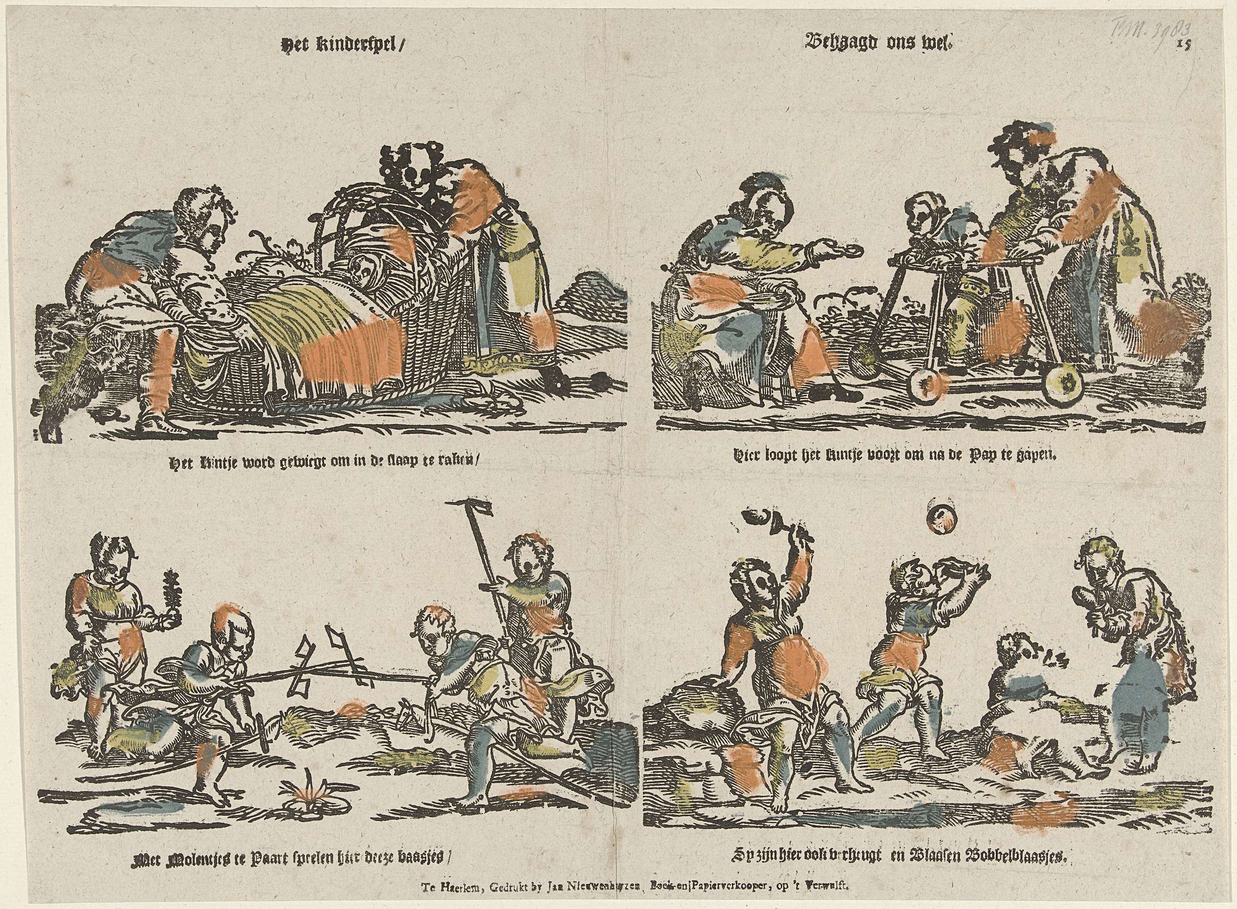 Blad met 4 voorstellingen van kinderspelen: wiegen, rolwagen, stokpaardjes met molentjes en bellenblazen. Onder elk plaatje een regel van een vers. Genummerd rechtsboven: 15.