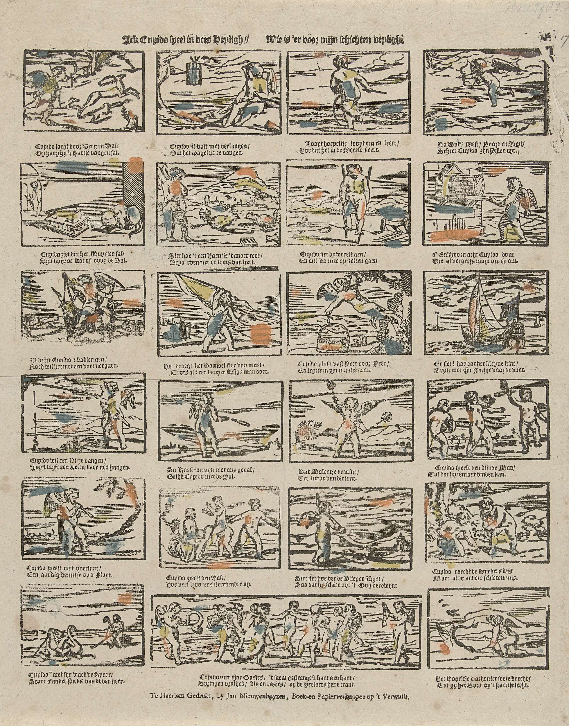 Blad met 23 voorstellingen van spelende Cupido's. Onder elk plaatje een tweeregelig versje. Genummerd rechtsboven: 17.
