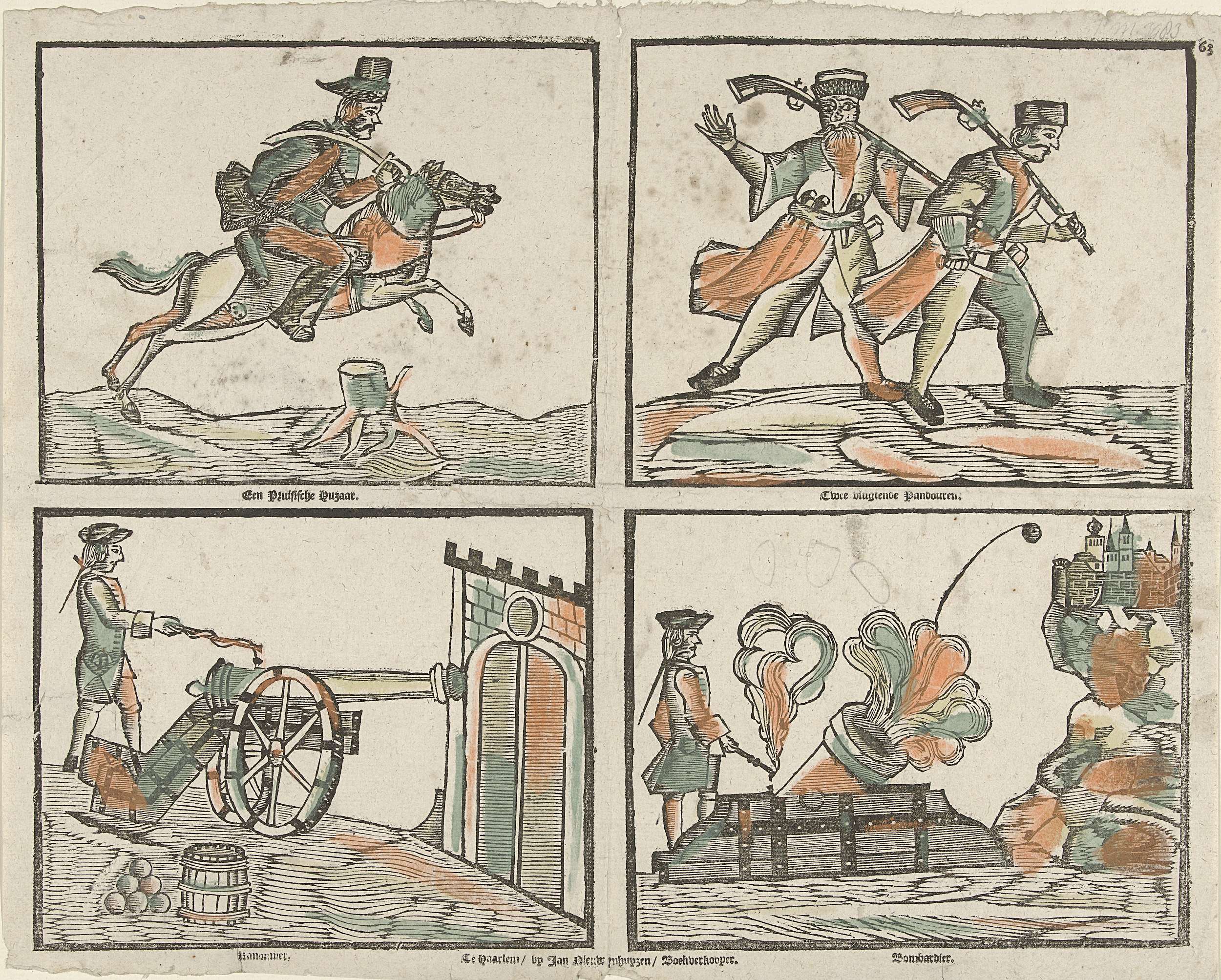 Blad met 4 voorstellingen met militairen: Pruisische huzaar te paard, twee vluchtende Pandoeren, kanonnier en bombardier. Elk plaatje met een onderschrift. Genummerd rechtsboven: 63.