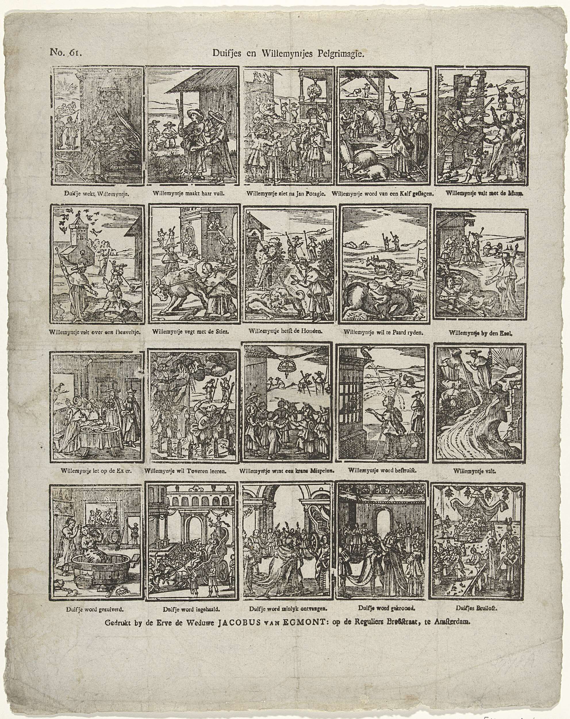 Blad met 20 voorstellingen van het verhaal van de pelgrimage van Duifje en Willemijntje. Onder elke afbeelding een onderschrift. Genummerd linksboven: No. 61.