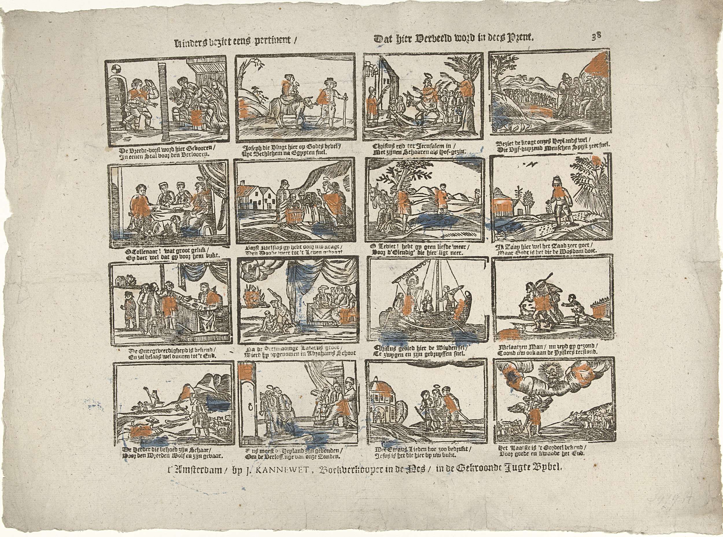 Blad met 16 voorstellingen uit het leven van Christus, zoals de geboorte van Christus en het Laatste Oordeel. Onder elke afbeelding een tweeregelig vers. Genummerd rechtsboven: 38.
