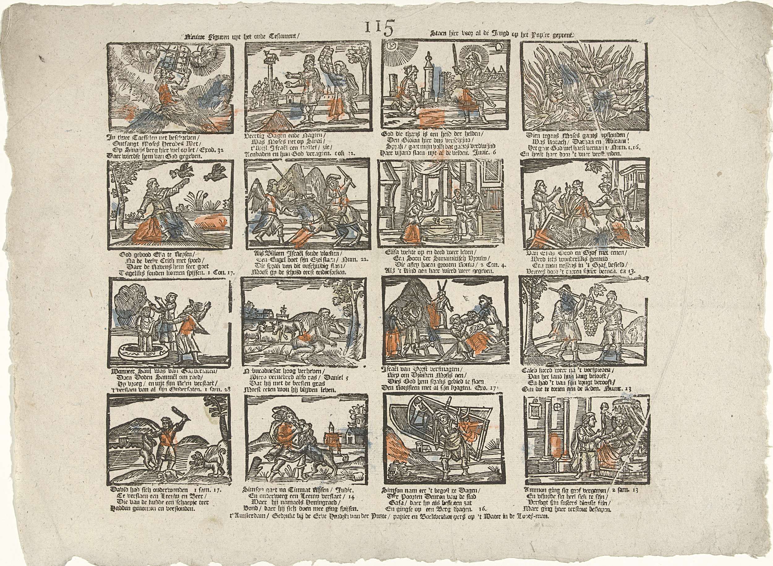 Blad met 16 voorstellingen van verhalen uit het Oude Testament. Onder elke afbeelding een vierregelig vers en een verwijzing naar de bijbehorende Bijbeltekst. Genummerd midden boven: 115.