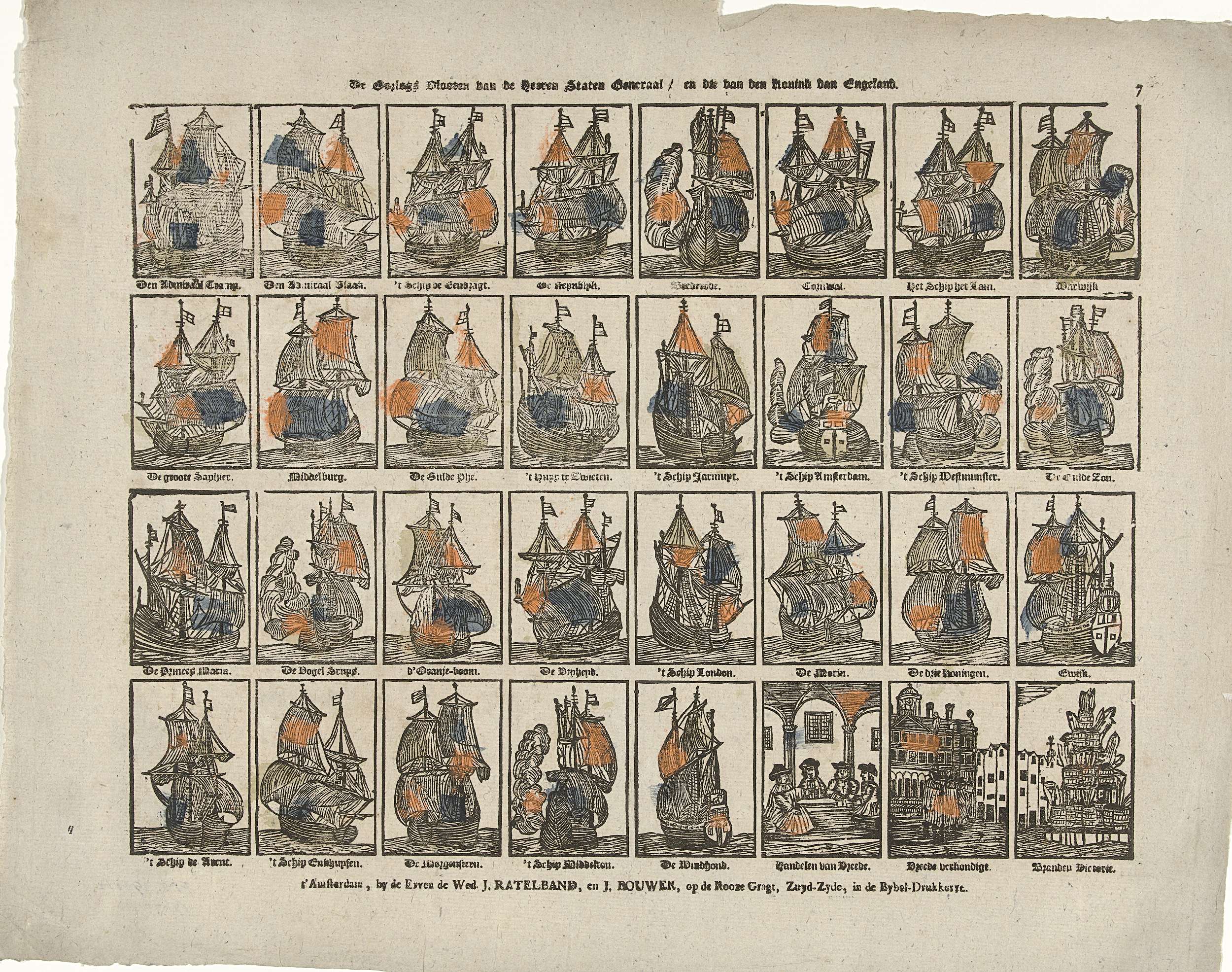 Blad met 32 voorstellingen van oorlogsschepen van de Republiek en van Engeland, de laatste 3 voorstellingen over de vrede gesloten tussen de Republiek en Engeland in 1654. Onder elke afbeelding de naam van het schip. Genummerd rechtsboven: 7.