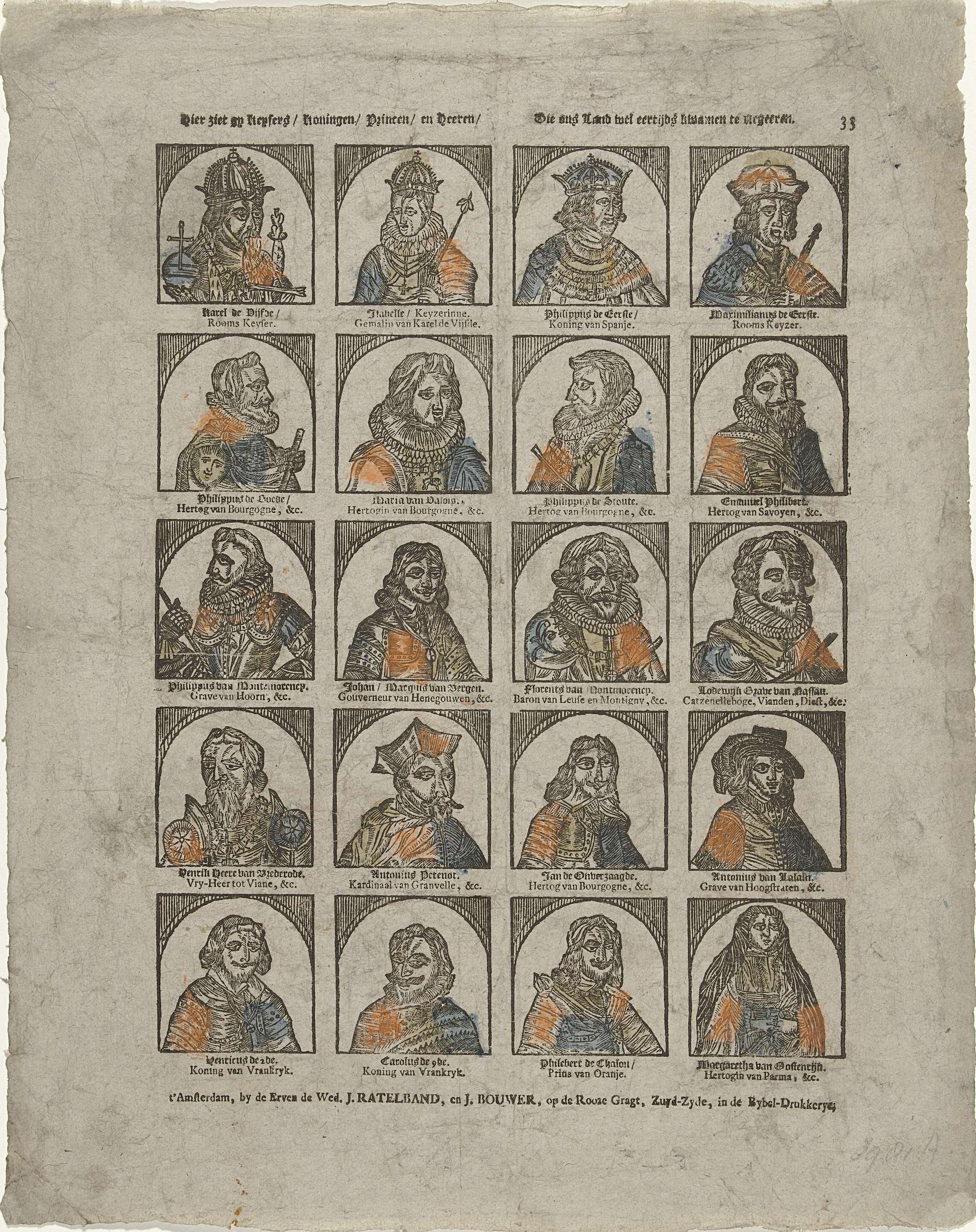 Blad met 20 portretten van vorsten en edellieden, onder wie Karel V van Habsburg, Karel IX en Filips II de Stoute. Onder elke afbeelding een onderschrift. Genummerd rechtsboven: 33.