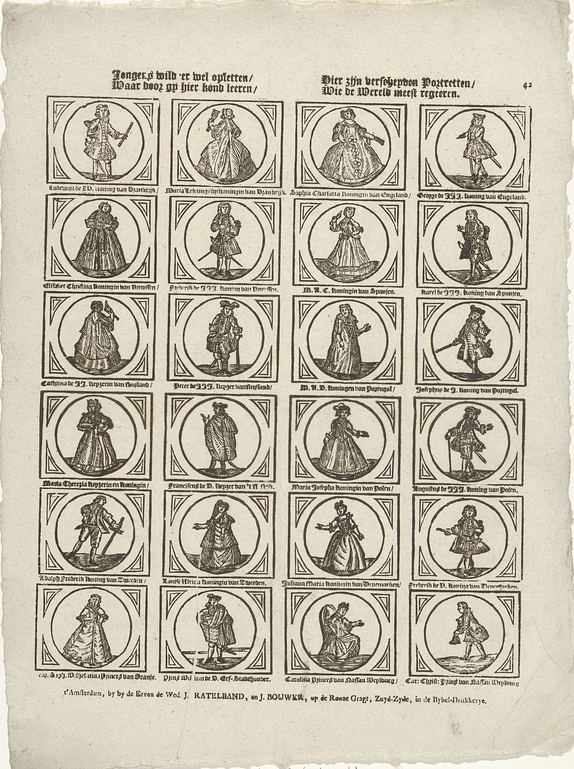Blad met 24 voorstellingen met fantasieportretten van alle Europese vorsten, in medaillons. Onder elke afbeelding de naam en titel van de vorst. Genummerd rechtsboven: 42.