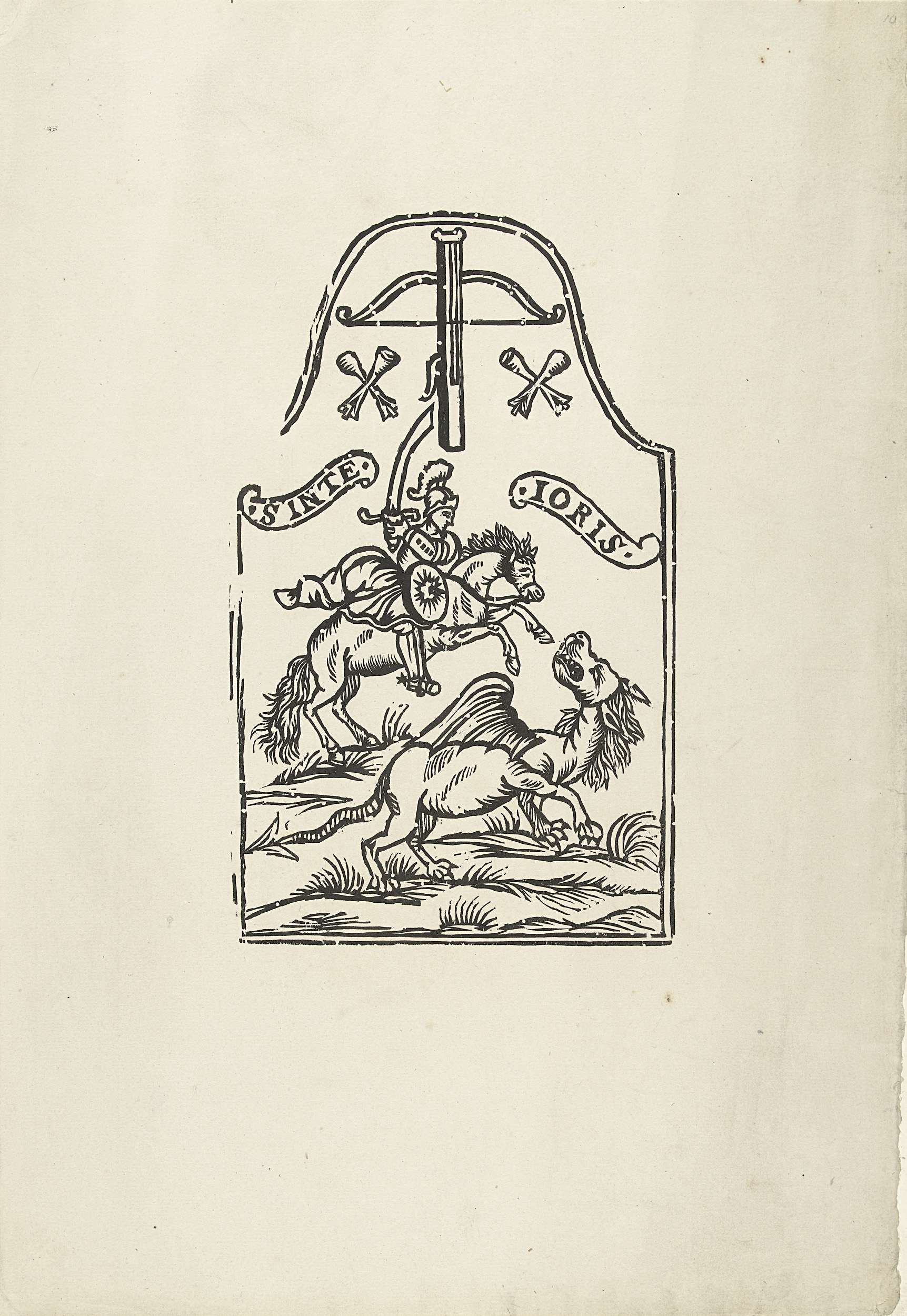 Paneel met Sint Joris die de draak verslaat, bovenaan een kruisboog met twee paren gekruiste pijlen, Sint-Jorisdoelen.