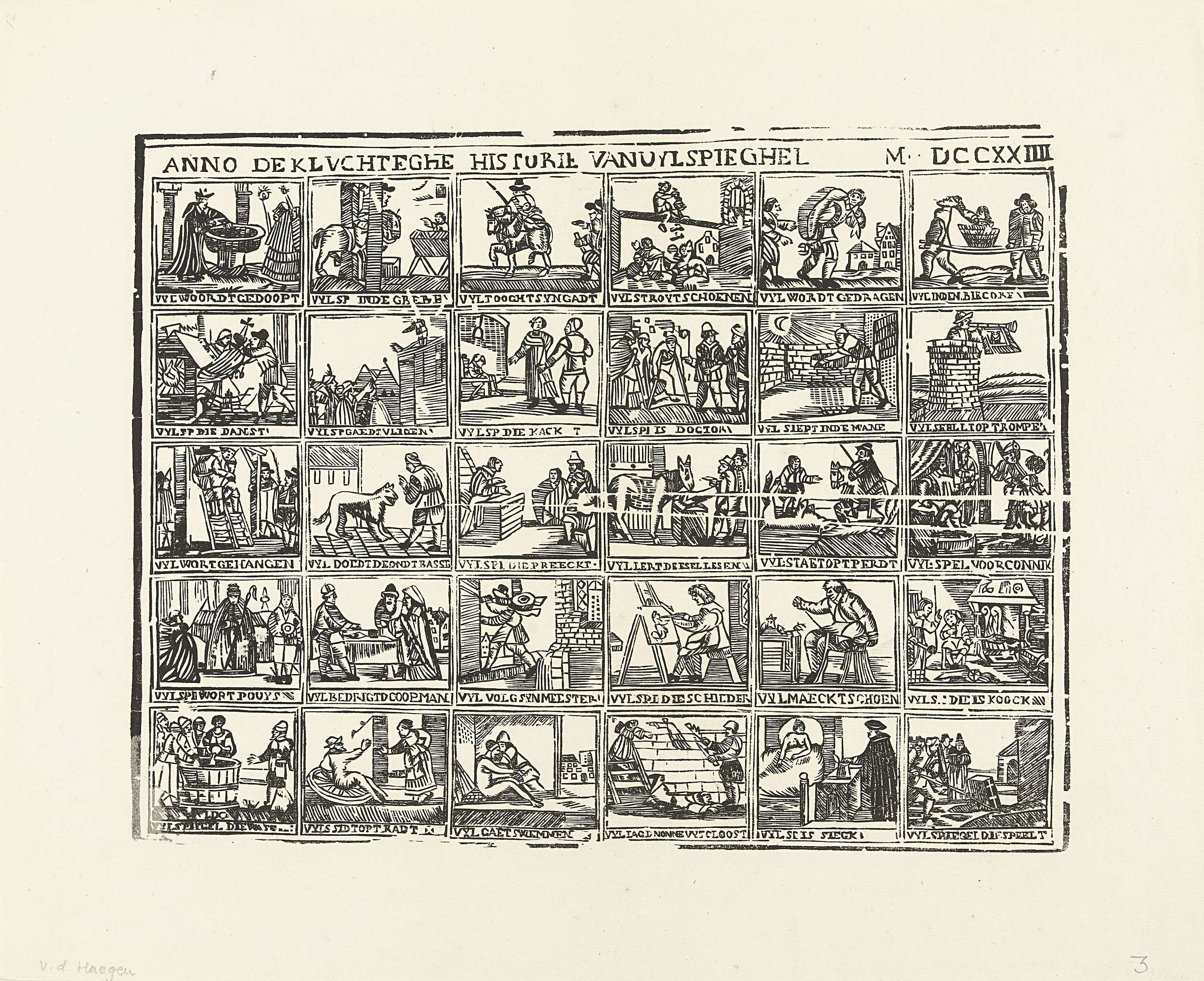 Blad met 30 voorstellingen over leven van Tijl Uilenspeigel. Onder elk plaatje een onderschrift.