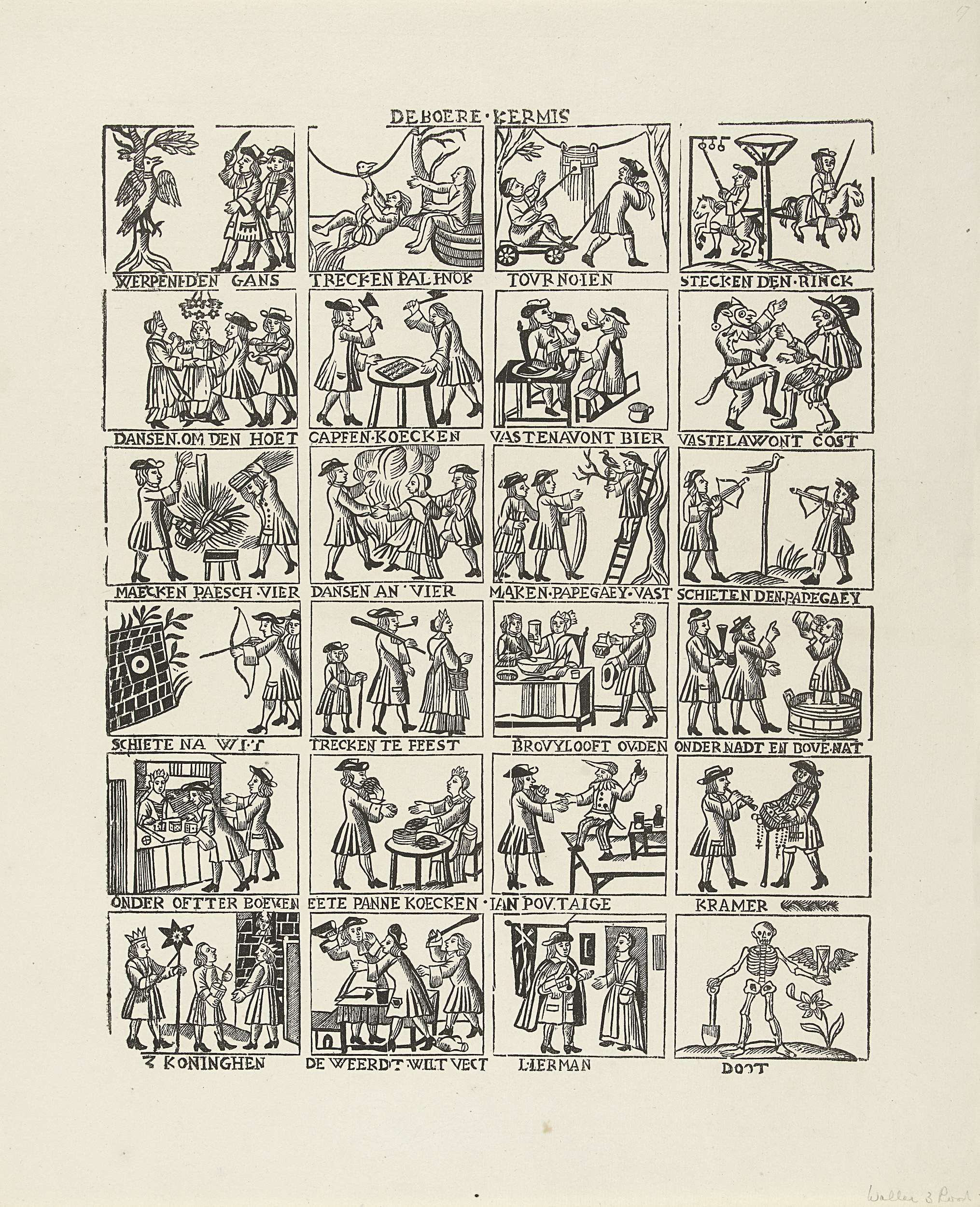 Blad met 24 voorstellingen van de boerenkermis. Onder elk plaatje een regel onderschrift.
