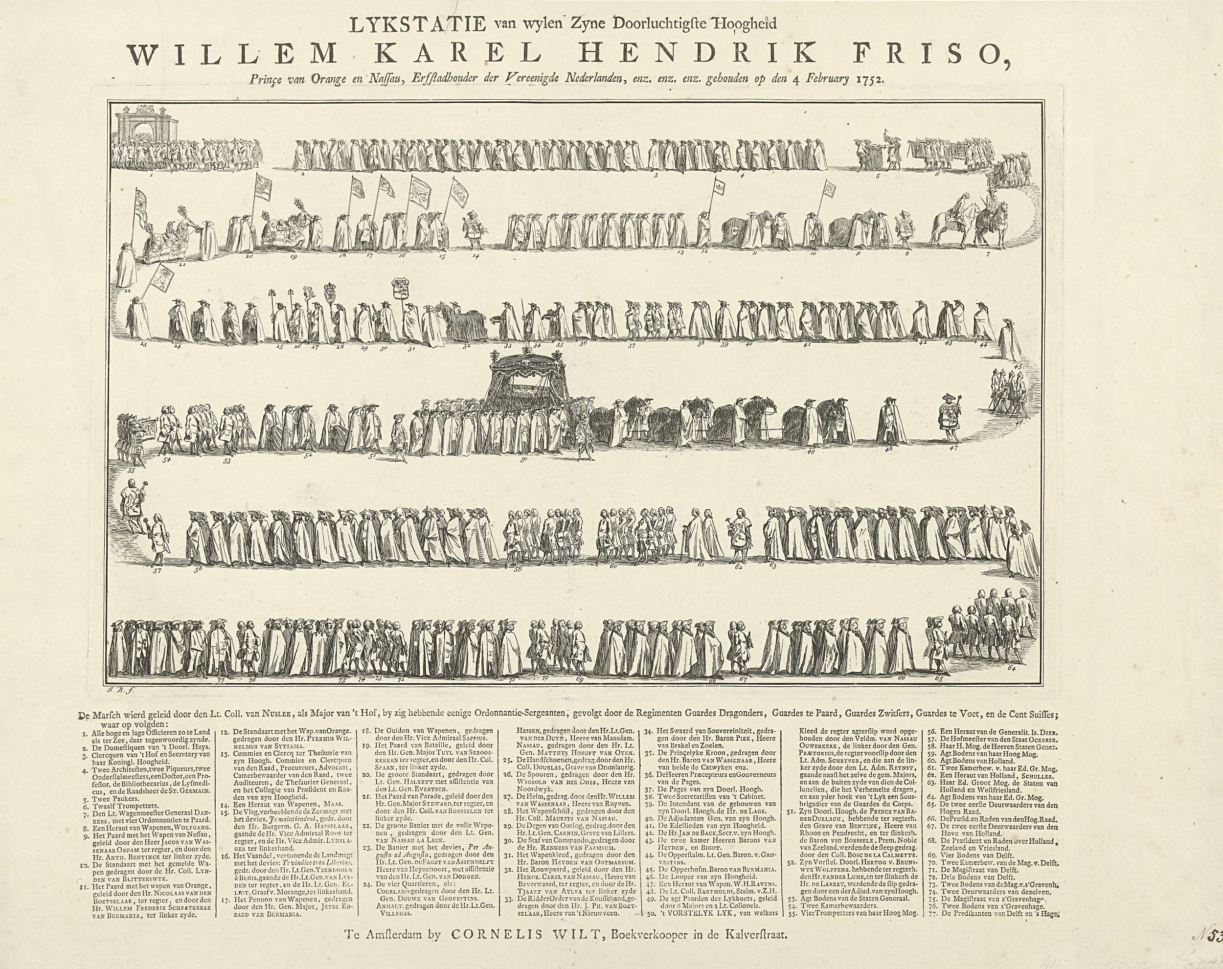 De begrafenisstoet van stadhouder Willem IV op 4 februari 1752 te Delft. Op het blad onder de plaat de legenda 1-77.