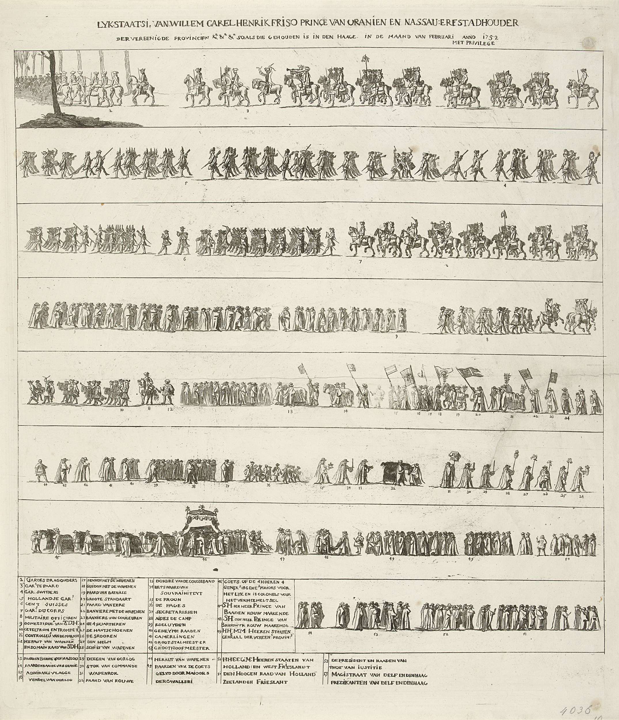 De begrafenisstoet van stadhouder Willem IV op 4 februari 1752 te Delft. Processie afgebeeld in acht aparte rijen onder elkaar. Linksonderaan in de plaat de legenda 1-53.