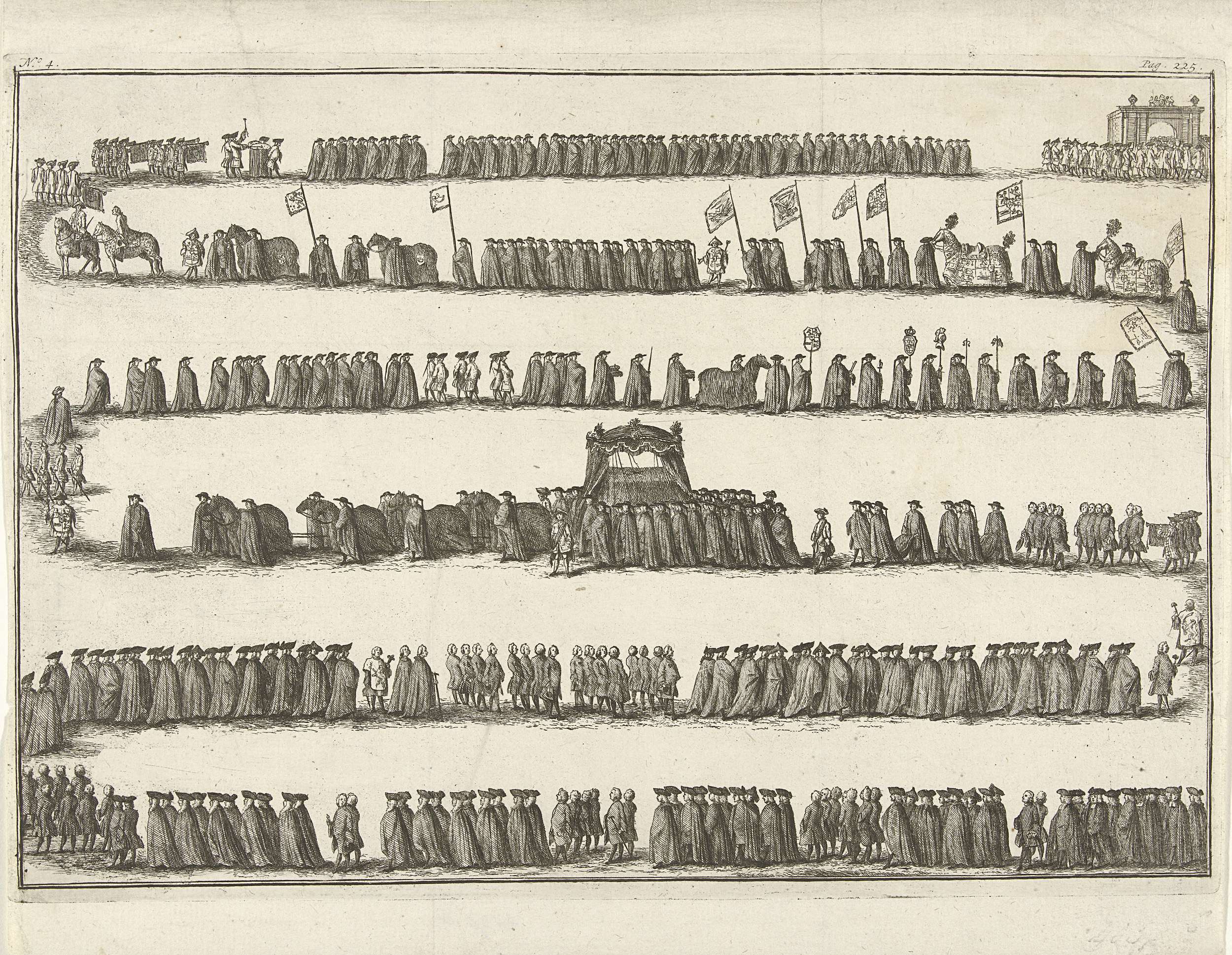 De begrafenisstoet van stadhouder Willem IV te Delft op 4 februari 1752, in een slinger in zes rijen onder elkaar. Gemerkt boven links: No 4 en rechts: Pag. 225.
