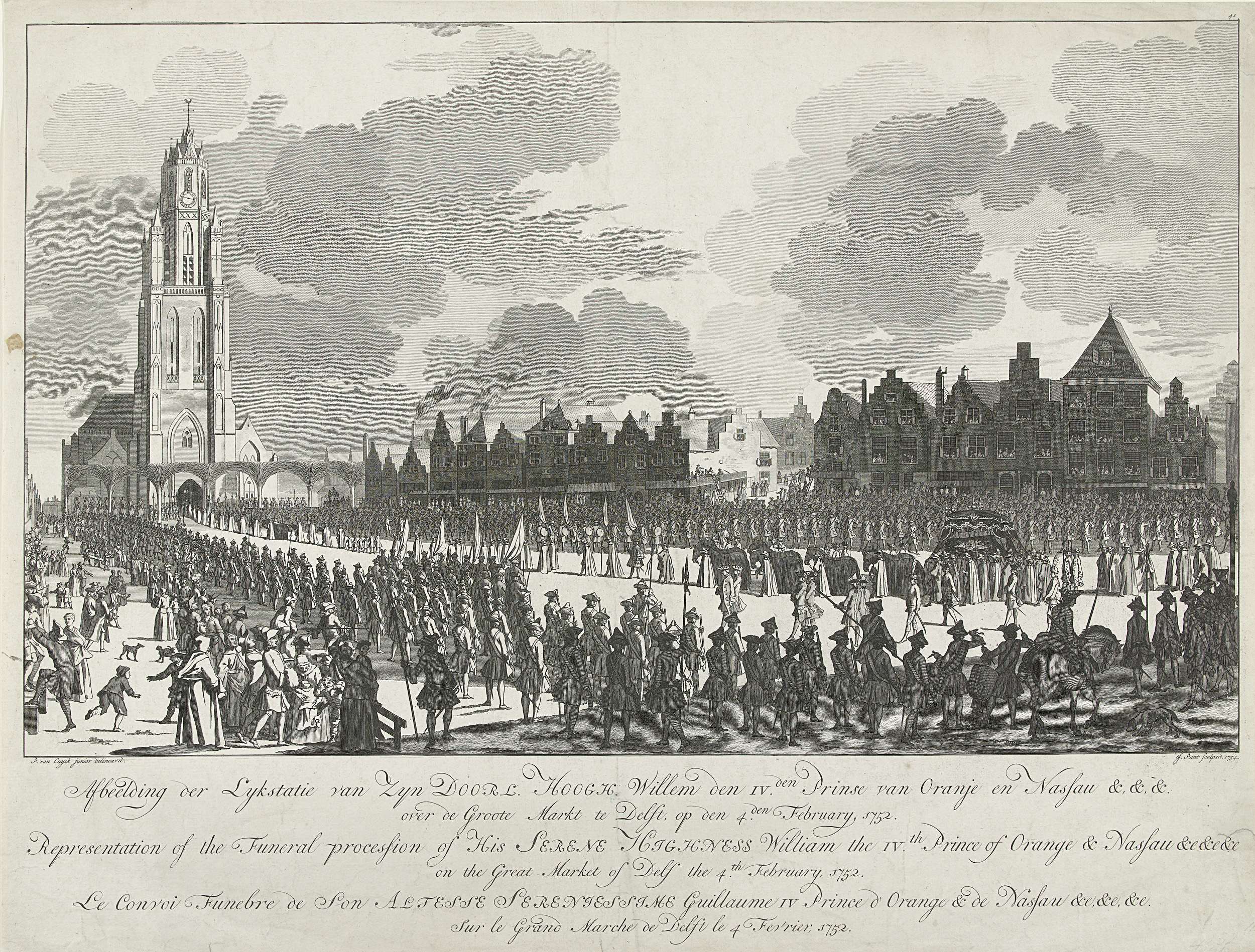 Aankomst van de rouwstoet met de lijkwagen op de Grote Markt te Delft en de intocht in de Nieuwe Kerk. In de marge het onderschrift in Nederlands, Frans en Engels. Onderdeel van een serie van 41 platen van de begrafenisstoet van stadhouder Willem IV te Delft op 4 februari 1752. Genummerd rechtsboven: 41.