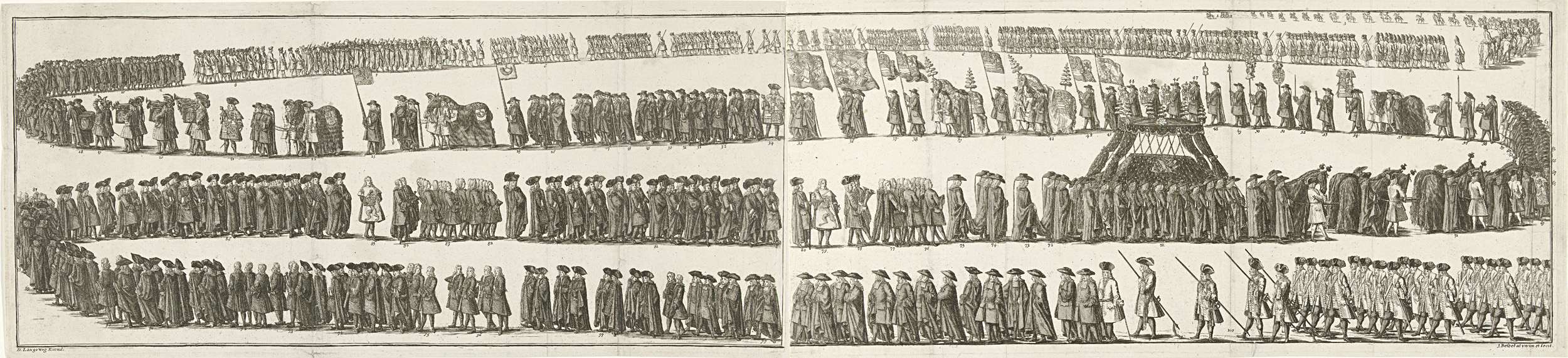 De rouwstoet met de lijkwagen en doodskist van stadhouder Willem IV, begrafenis te Delft op 4 februari 1752. Grote voorstelling gedrukt op twee bladen, zonder teksten. Waarschijnlijk de plaat behorend bij de apart gedrukte beschrijving.