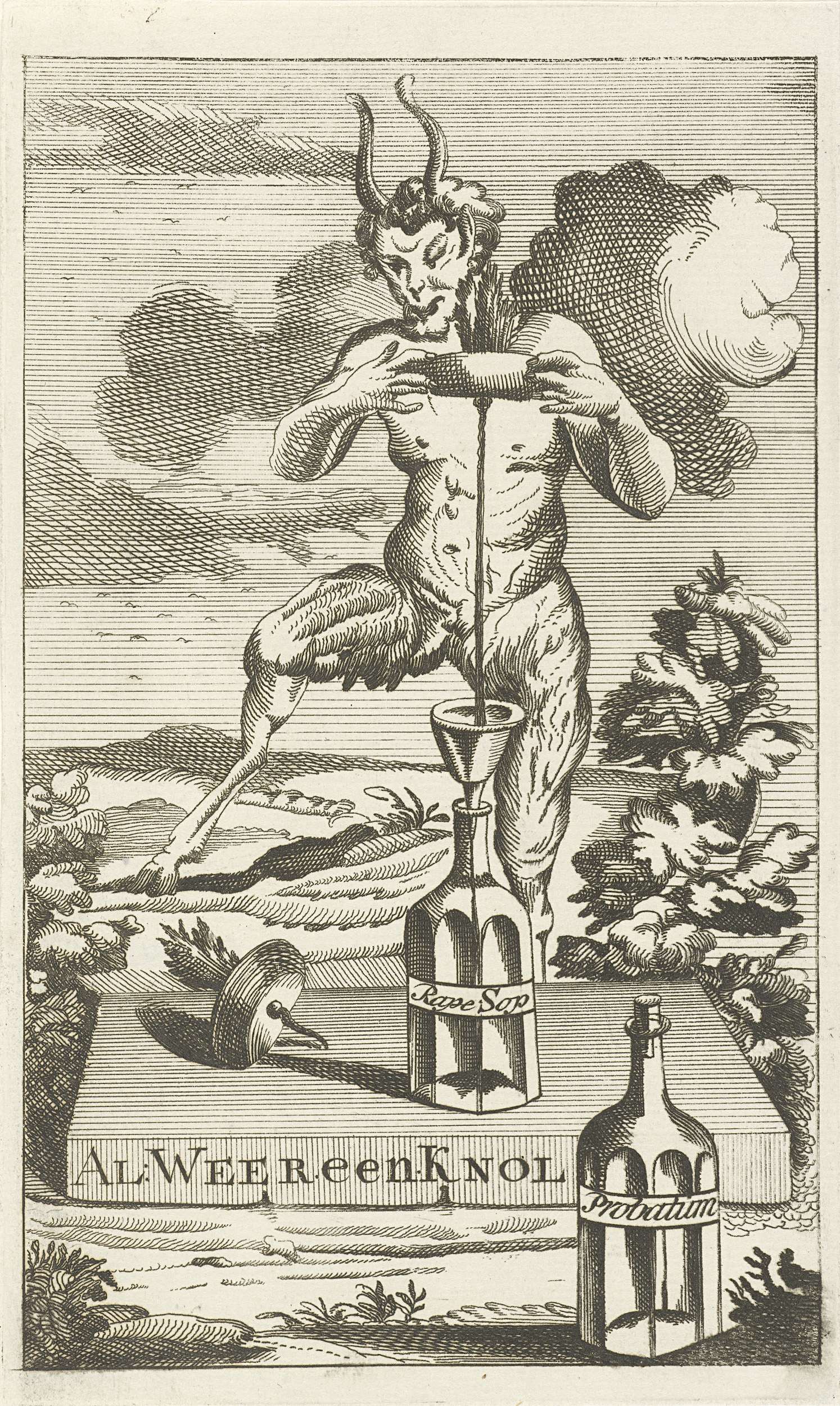 Spotprent op de Doelist Daniël Raap wegens zijn advies in 1752 om de belasting op de wijn niet meer te verpachten, maar door de wijnkopers te laten betalen. De duivel perst rapensap in een fles gemerkt: Rape Sop.